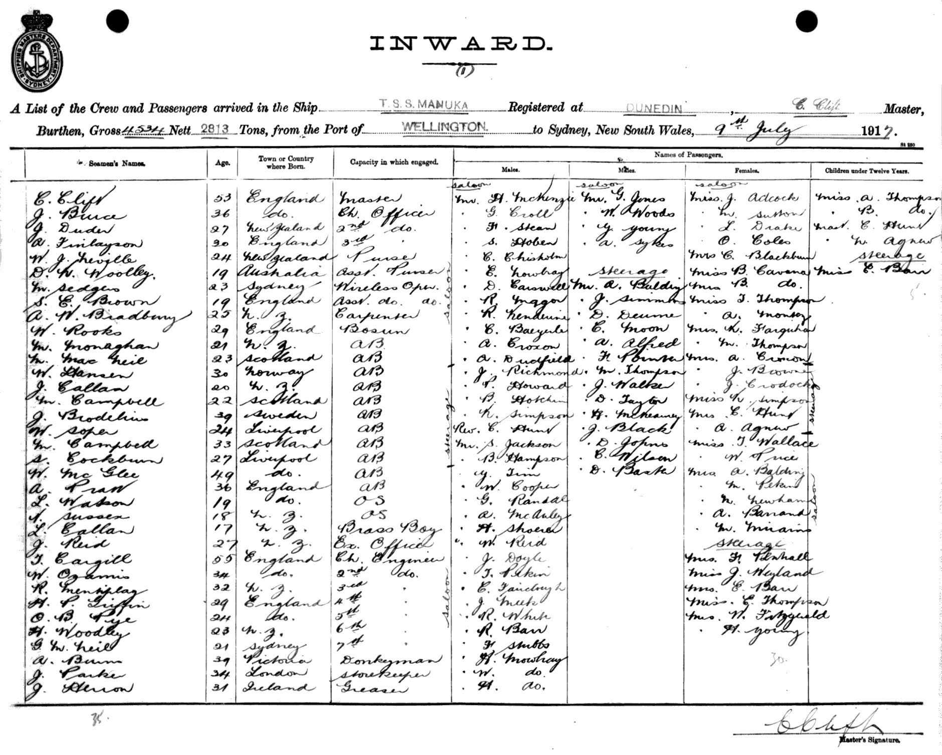 MANUKAOF DUNEDIN, C. CLIFT, MASTER, BURTHEN 4534/2813 TONS FROM THE PORT OF WELLINGTON TO SYDNEY, NEW SOUTH WALES, 9TH JULY 1917 |