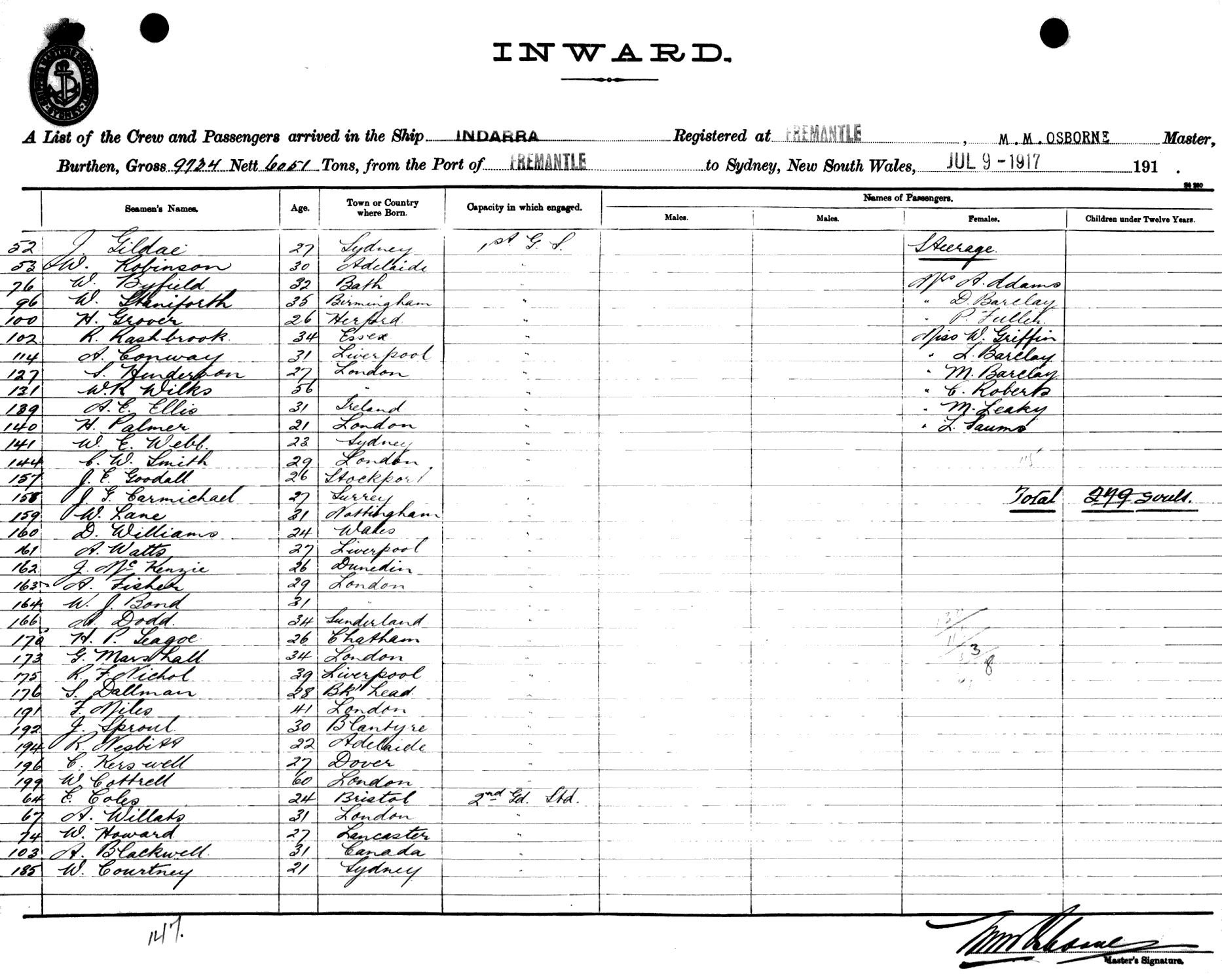 INDARRAOF FREMANTLE, M. M. OSBORNE, MASTER, BURTHEN 9734/6051 TONS FROM THE PORT OF FREMANTLE TO SYDNEY, NEW SOUTH WALES, 9TH JULY 1917 |