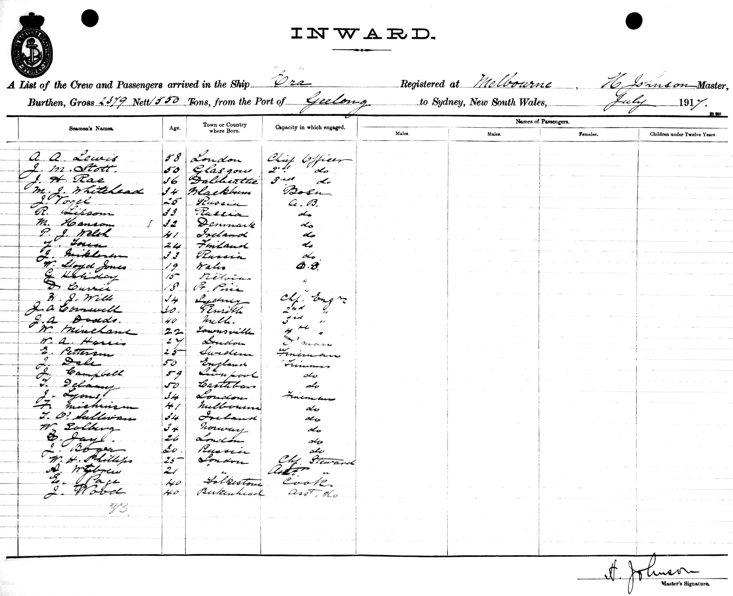 ERAOF MELBOURNE, H. JOHNSON, MASTER, BURTHEN 2379/1550 TONS FROM THE PORT OF GEELONG TO SYDNEY, NEW SOUTH WALES, (9TH) JULY 1917 |