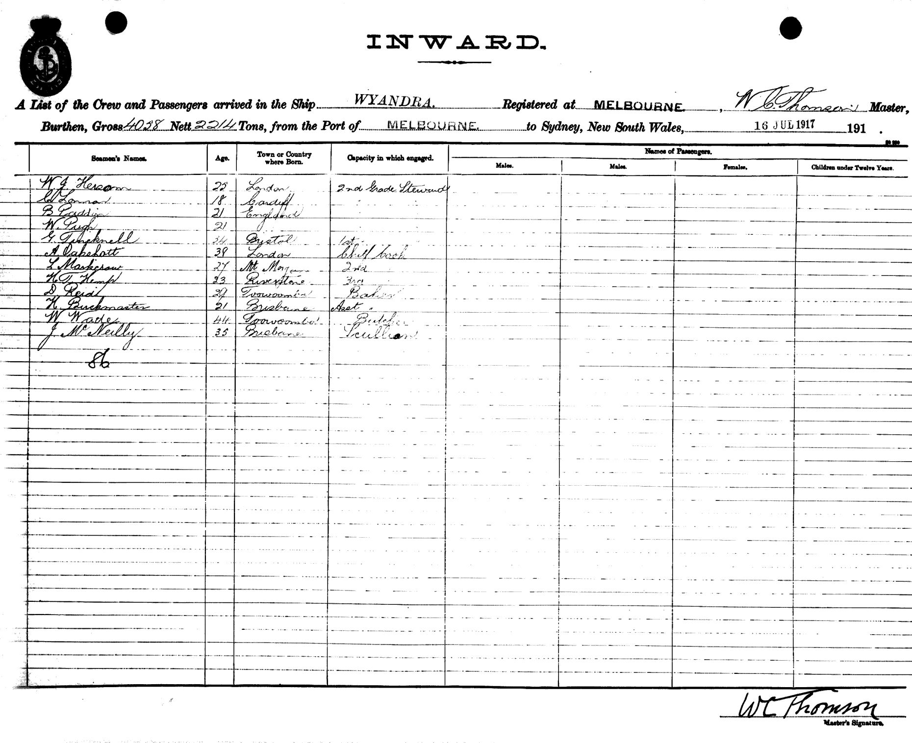WYANDRAOF MELBOURNE, W. C. THOMSON, MASTER, BURTHEN 4058/2214 TONS FROM THE PORT OF MELBOURNE TO SYDNEY, NEW SOUTH WALES, 16TH JULY 1917 |