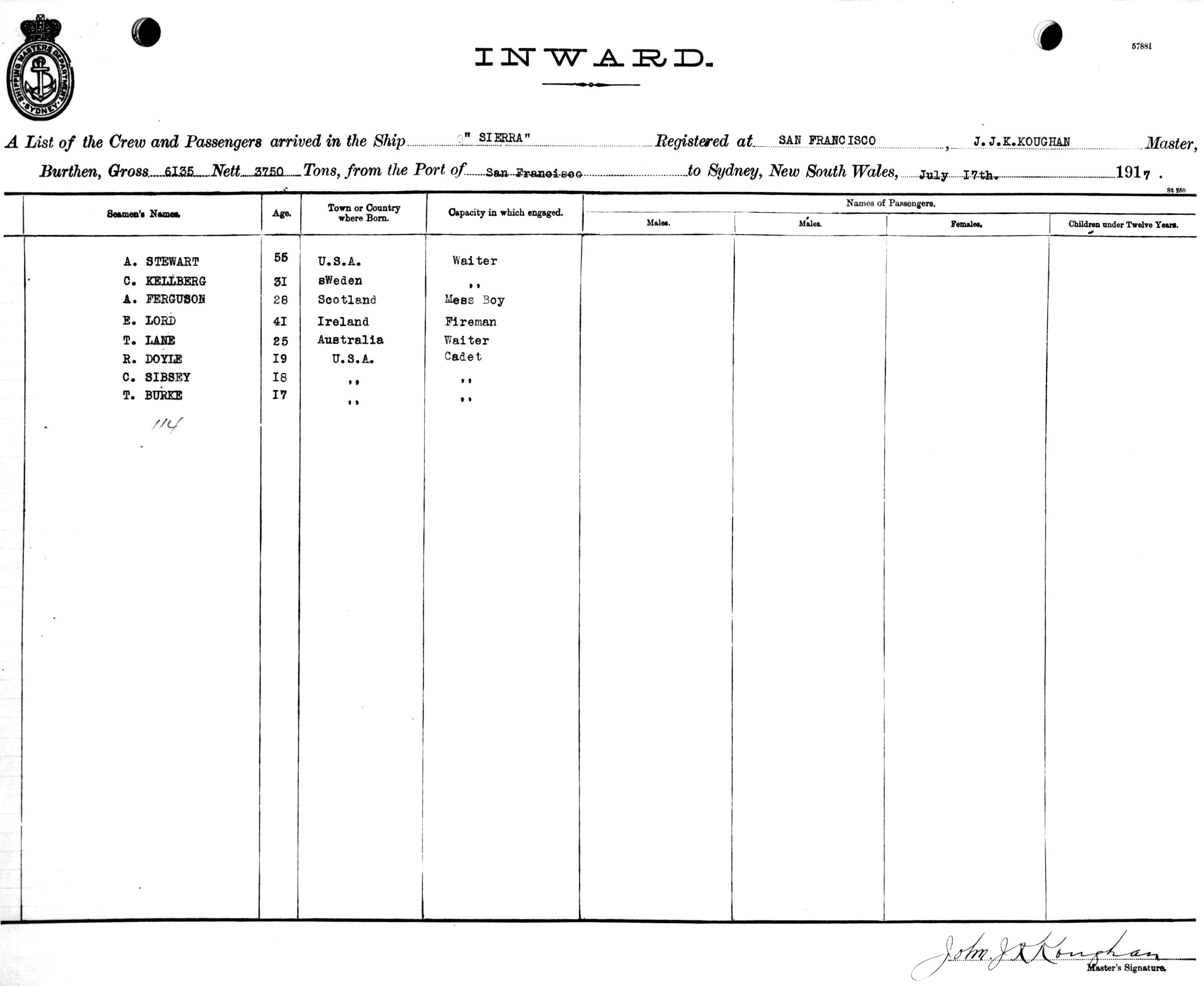 SIERRAOF SAN FRANCISCO, J. J. KOUGHAN, MASTER, BURTHEN 6135/3750 TONS FROM THE PORT OF SAN FRANCISCO TO SYDNEY, NEW SOUTH WALES, 17TH JULY 1917 |