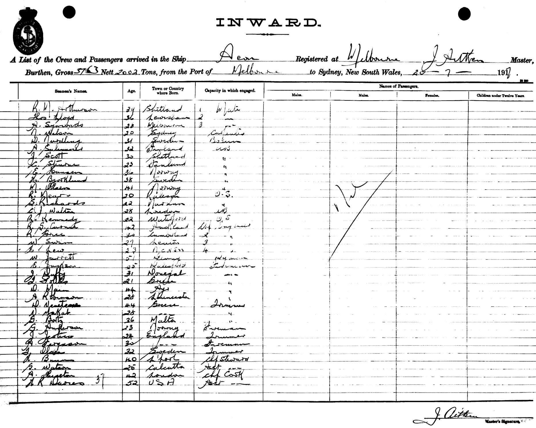 AEONOF MELBOURNE, J. AITKEN, MASTER, BURTHEN 3763/2002 TONS FROM THE PORT OF MELBOURNE TO SYDNEY, NEW SOUTH WALES, 20TH JULY 1917 |