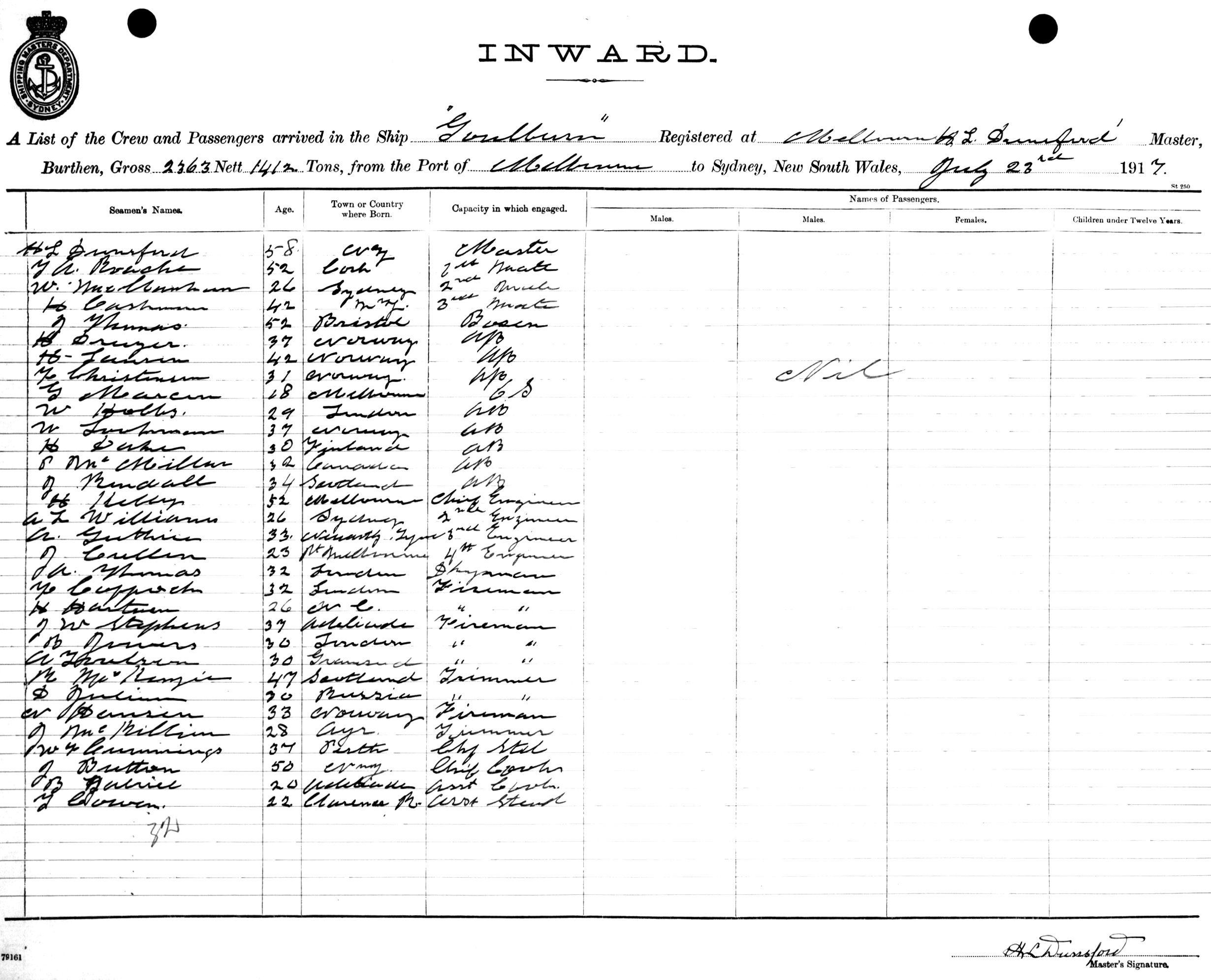 GOULBURNOF MELBOURNE, H. L. DUNSFORD, MASTER, BURTHEN 2363/1412 TONS FROM THE PORT OF MELBOURNE TO SYDNEY, NEW SOUTH WALES, 23RD JULY 1917 |