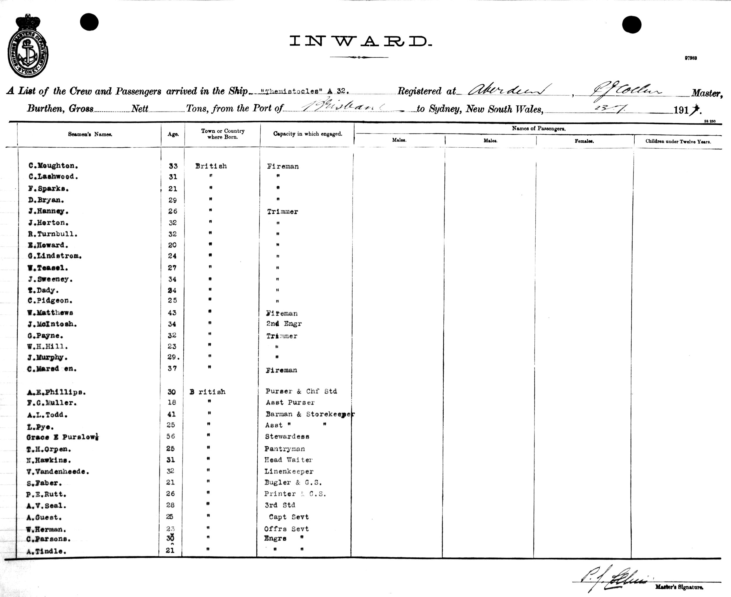 THEMISTOCLESOF ABERDEEN, P. J. COLLINS, MASTER, BURTHEN 11231/7046 TONS FROM THE PORT OF BRISBANE TO SYDNEY, NEW SOUTH WALES, 23RD JULY 1917 |