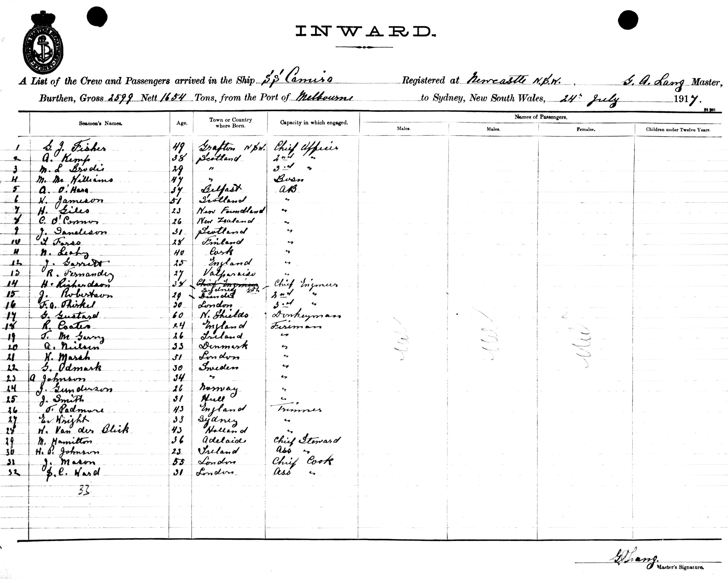 CAMIRAOF NEWCASTLE, N.S.W. , G. A. LANG, MASTER, BURTHEN 2599/1654 TONS FROM THE PORT OF MELBOURNE TO SYDNEY, NEW SOUTH WALES, 24TH JULY 1917 |