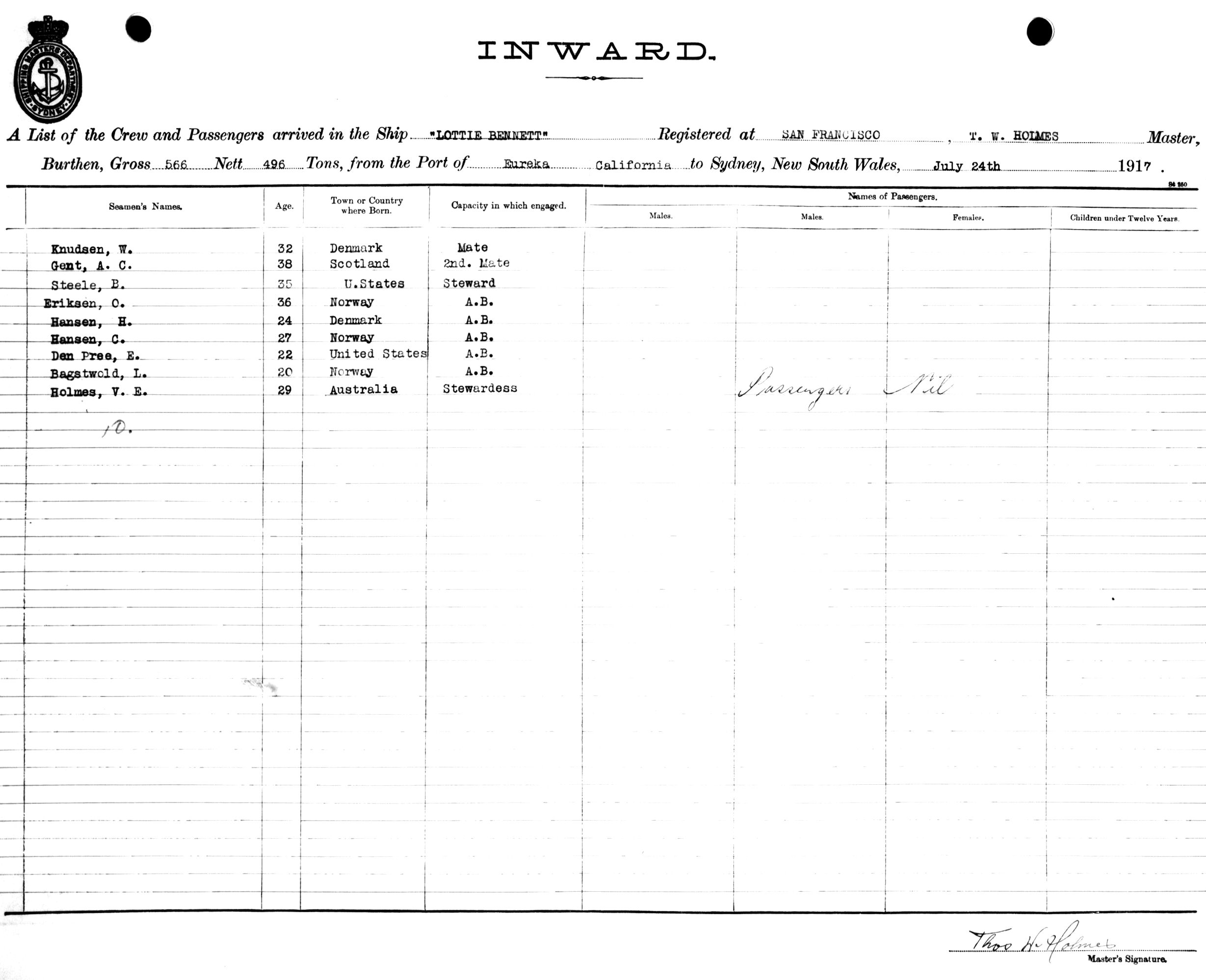 LOTTIE BENNETTOF SAN FRANCISCO, T. W. HOLMES, MASTER, BURTHEN 566/496 TONS FROM THE PORT OF EUREKA, CALIFORNIA TO SYDNEY, NEW SOUTH WALES, 24TH JULY 1917 |