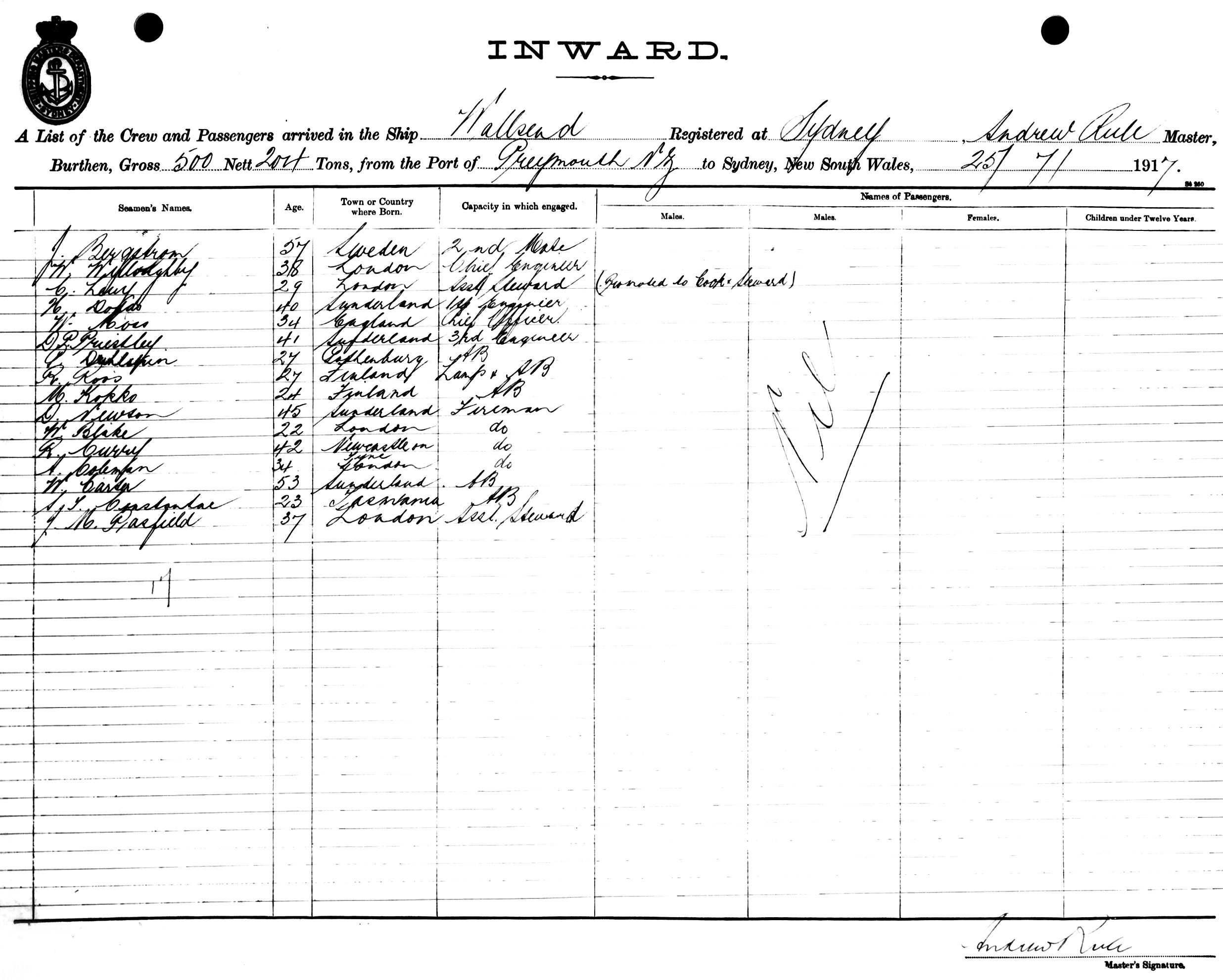 WALLSENDOF SYDNEY, ANDREW RULE, MASTER, BURTHEN 500/204 TONS FROM THE PORT OF GREYMOUTH, N.Z. TO SYDNEY, NEW SOUTH WALES, 25TH JULY 1917 |