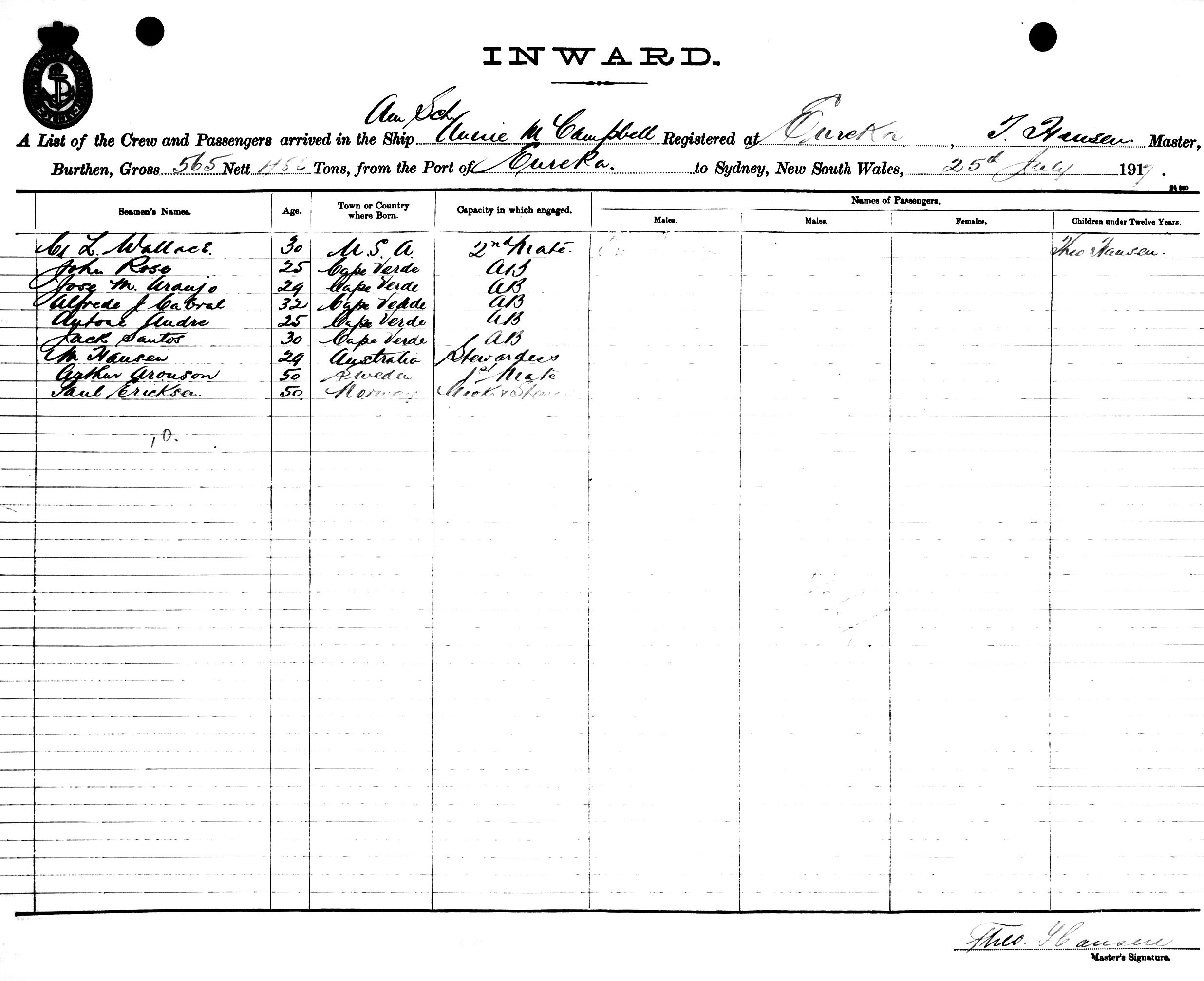 ANNIE M CAMPBELLOF EUREKA, T. HANSEN, MASTER, BURTHEN 565/485 TONS FROM THE PORT OF EUREKA, U.S.A. TO SYDNEY, NEW SOUTH WALES, 25TH JULY 1917 |