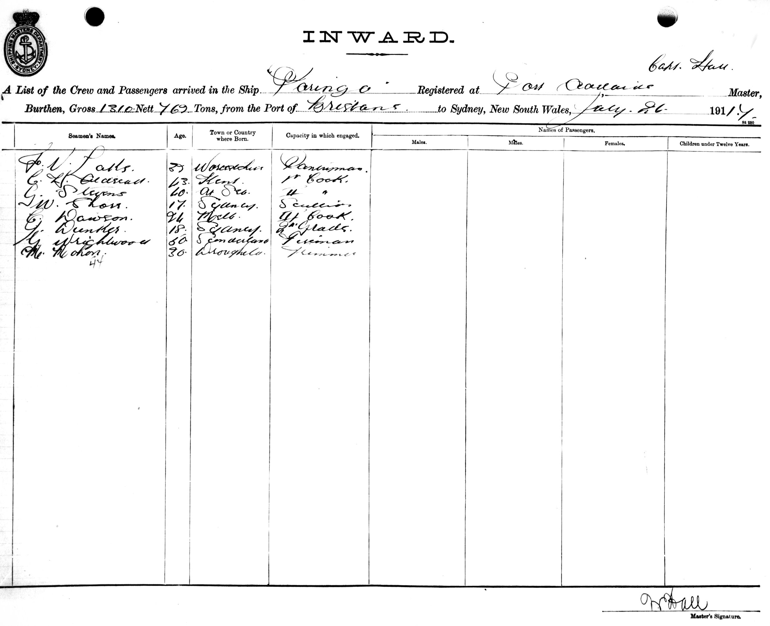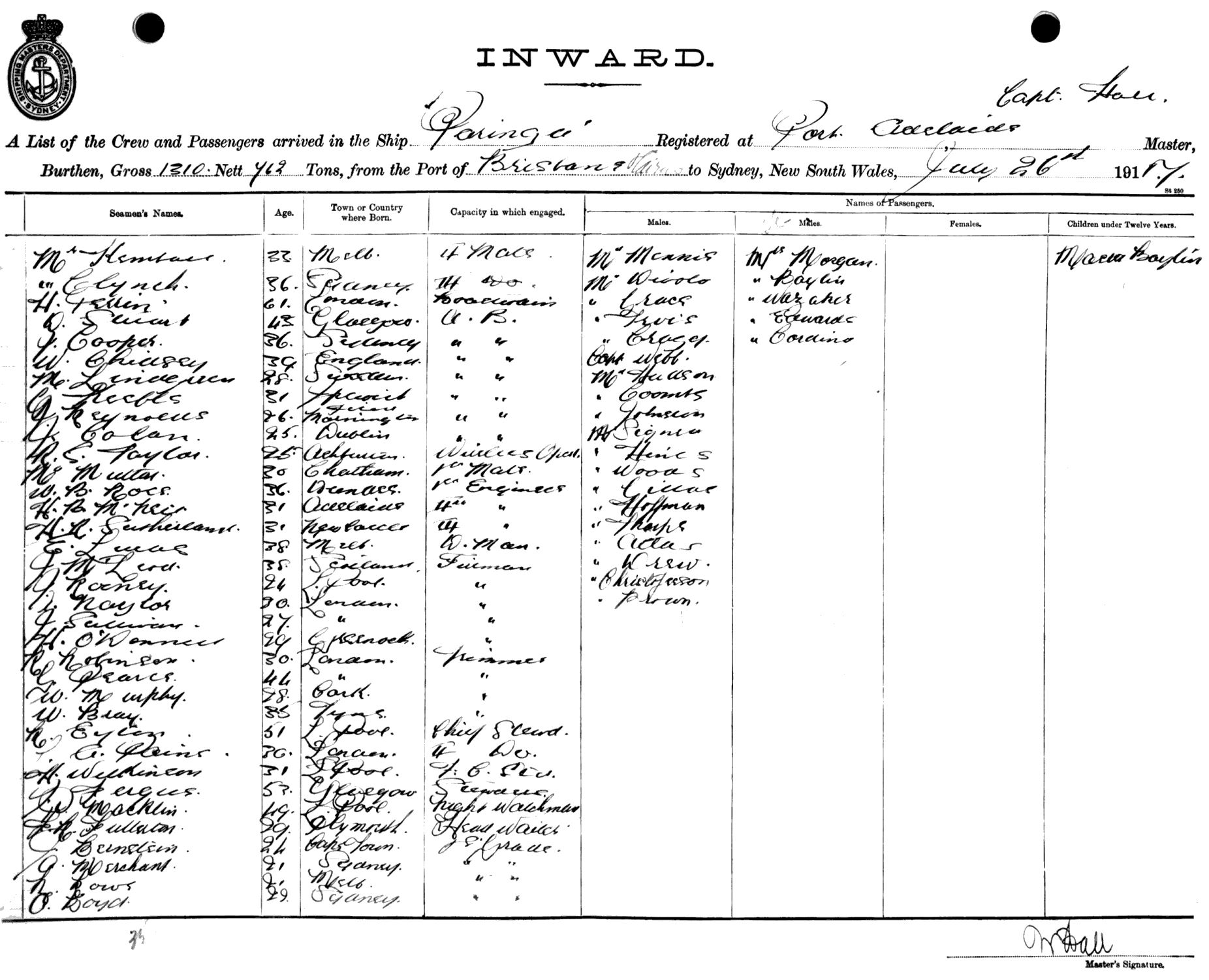 PARINGAOF PORT ADELAIDE, W. HALL, MASTER, BURTHEN 1310/762 TONS FROM THE PORT OF BRISBANE & CAIRNS TO SYDNEY, NEW SOUTH WALES, 26TH JULY 1917 |