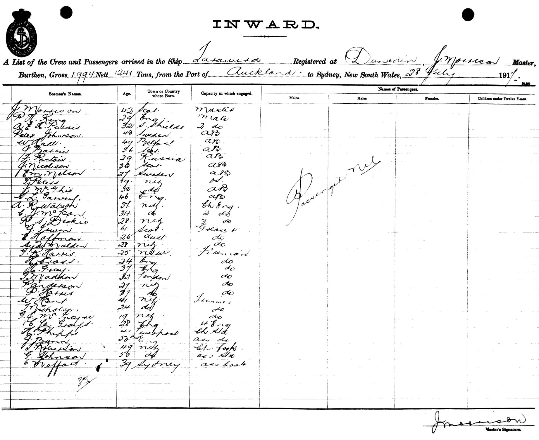 TARAWERAOF DUNEDIN, J. MORRISON, MASTER, BURTHEN 1994/1241 TONS FROM THE PORT OF AUCKLAND TO SYDNEY, NEW SOUTH WALES, 28TH JULY 1917 |