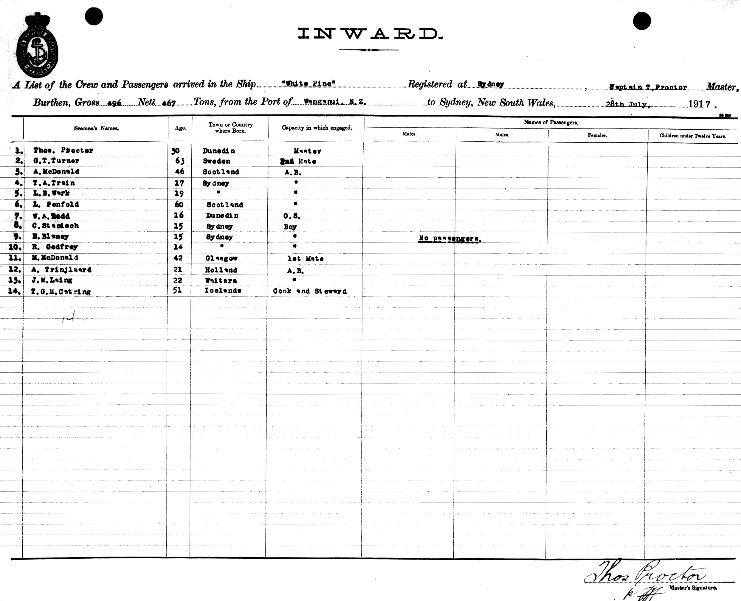 WHITE PINEOF SYDNEY, CAPTAIN T. PROCTOR, MASTER, BURTHEN 496/467 TONS FROM THE PORT OF WANGANUI, N.Z. TO SYDNEY, NEW SOUTH WALES, 28TH JULY 1917 |