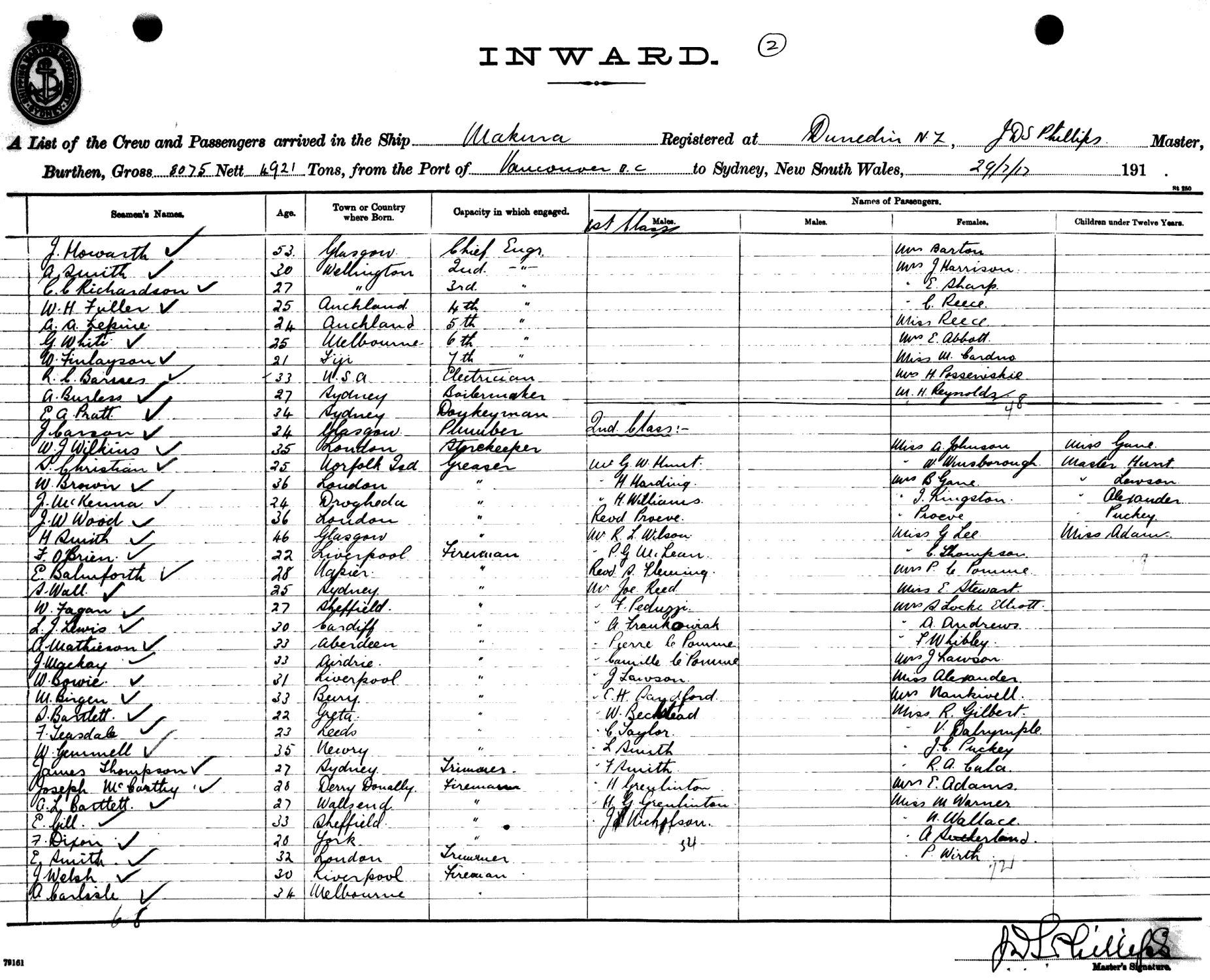 Mariners and ships in Australian Waters | MAKURAOF DUNEDIN, N.Z., J. D. S. PHILLIPS, MASTER, BURTHEN 8075/4921 TONS FROM THE PORT OF VANCOUVER, B.C. TO SYDNEY, NEW SOUTH WALES, 29TH JULY 1917 |
