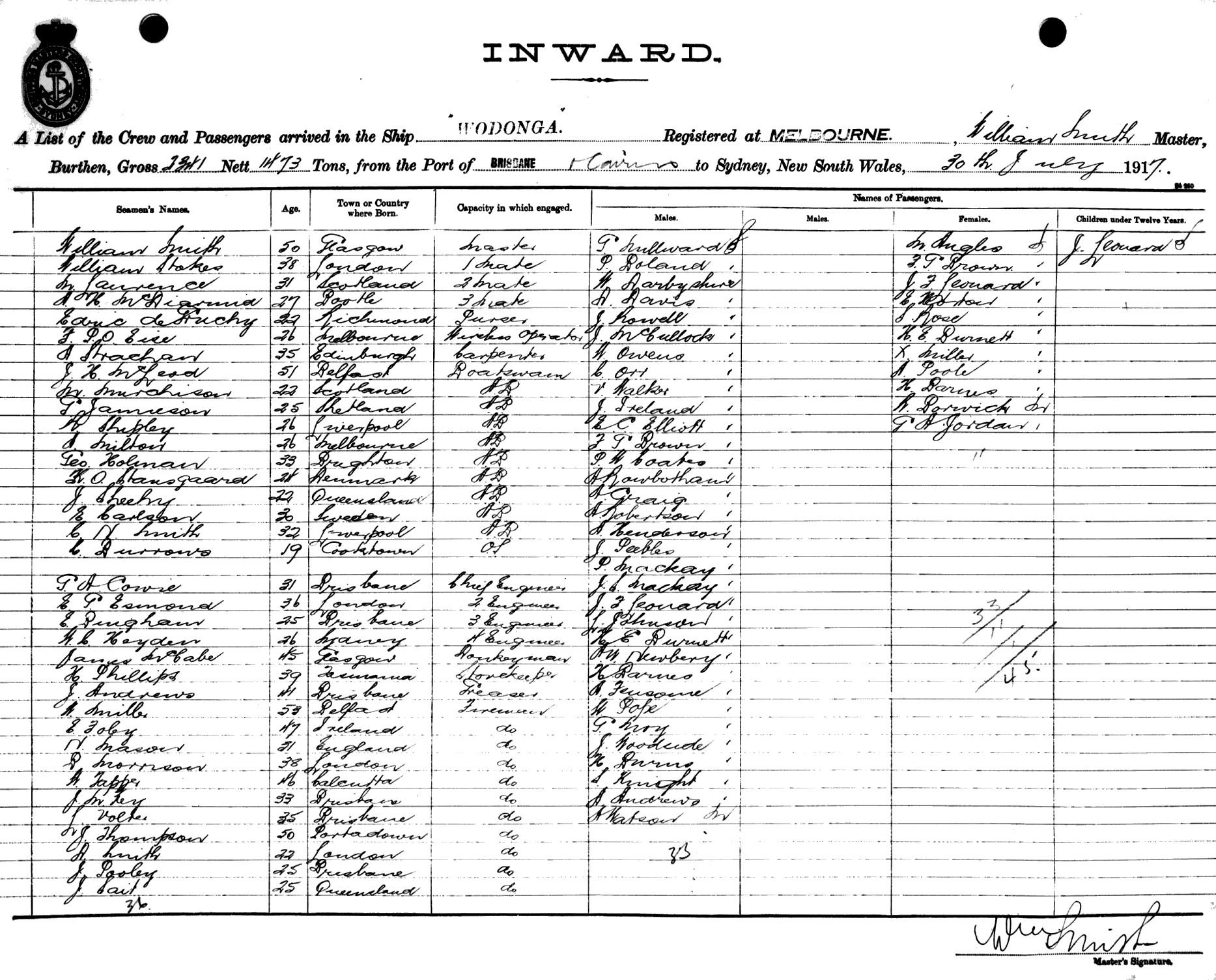 WODONGAOF MELBOURNE, WILLIAM SMITH, MASTER, BURTHEN 2341/1473 TONS FROM THE PORTS OF BRISBANE & CAIRNS TO SYDNEY, NEW SOUTH WALES, 30TH JULY 1917 |