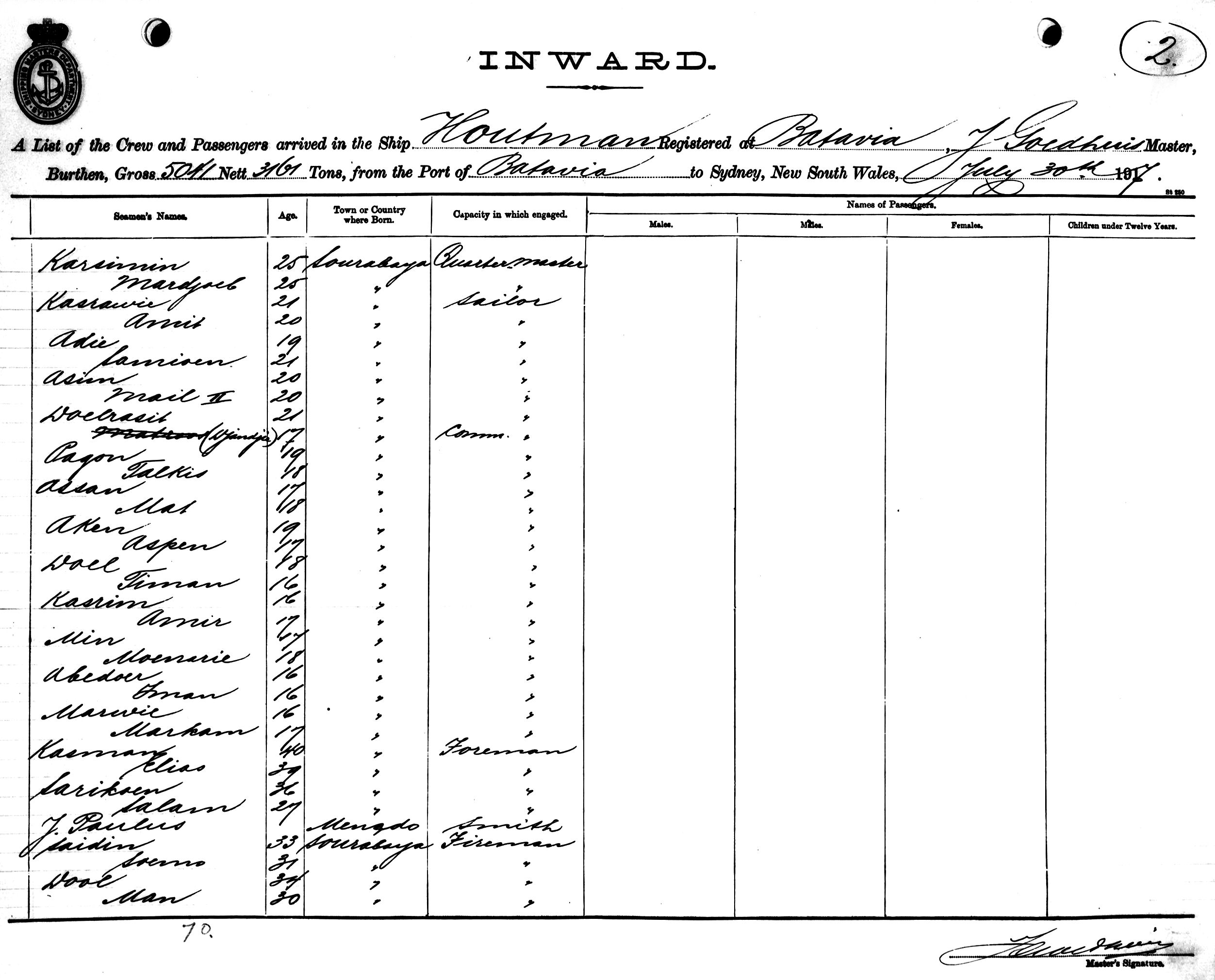 HOUTMANOF BATAVIA, J. GOEDHUIS, MASTER, BURTHEN 5041/3161 TONS FROM THE PORT OF BATAVIA VIA BRISBANE TO SYDNEY, NEW SOUTH WALES, 30TH JULY 1917 |