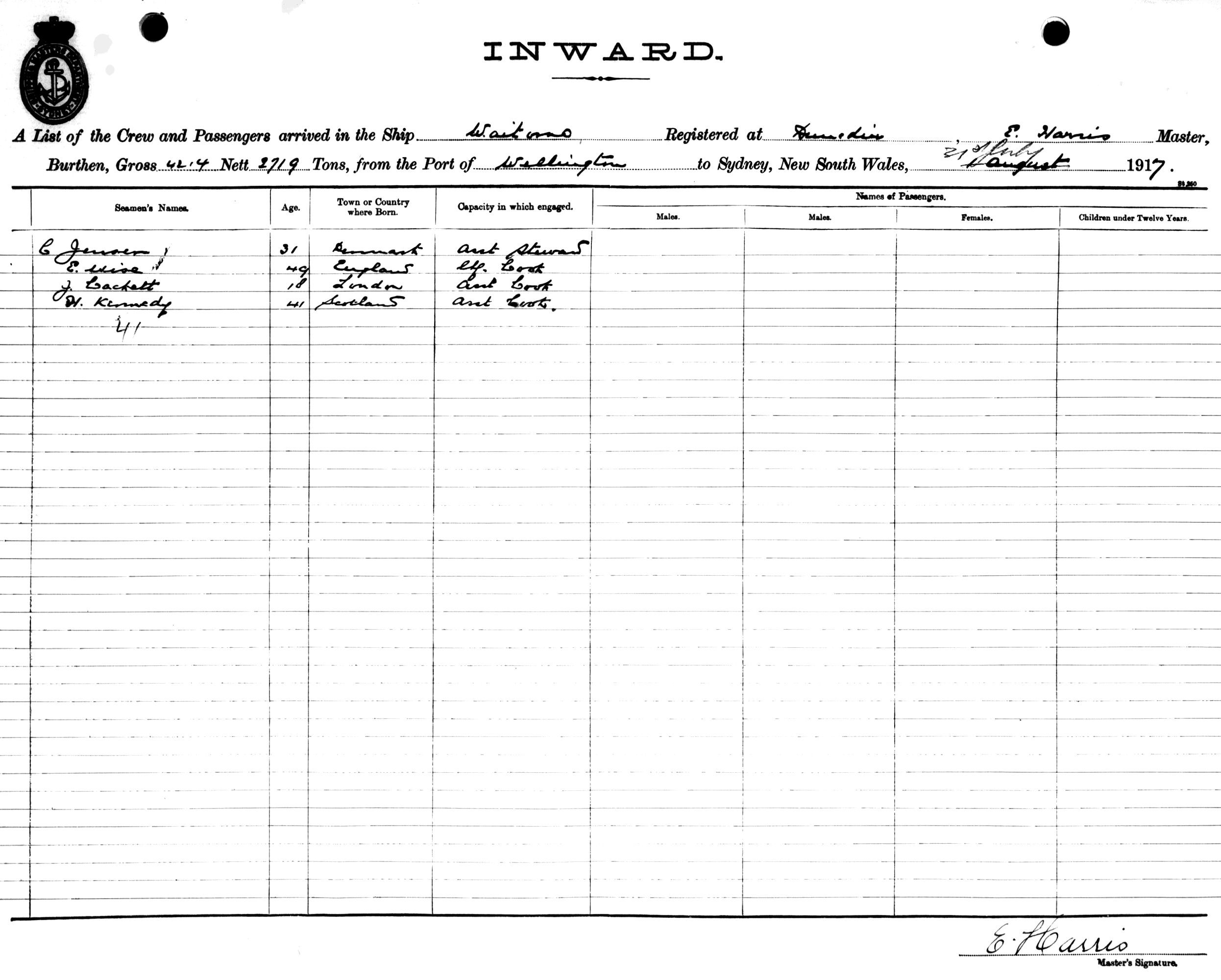WAITOMOOF DUNEDIN, E. HARRIS, MASTER, BURTHEN 4214/2719 TONS FROM THE PORT OF WELLINGTON TO SYDNEY, NEW SOUTH WALES, 31ST JULY 1917 |