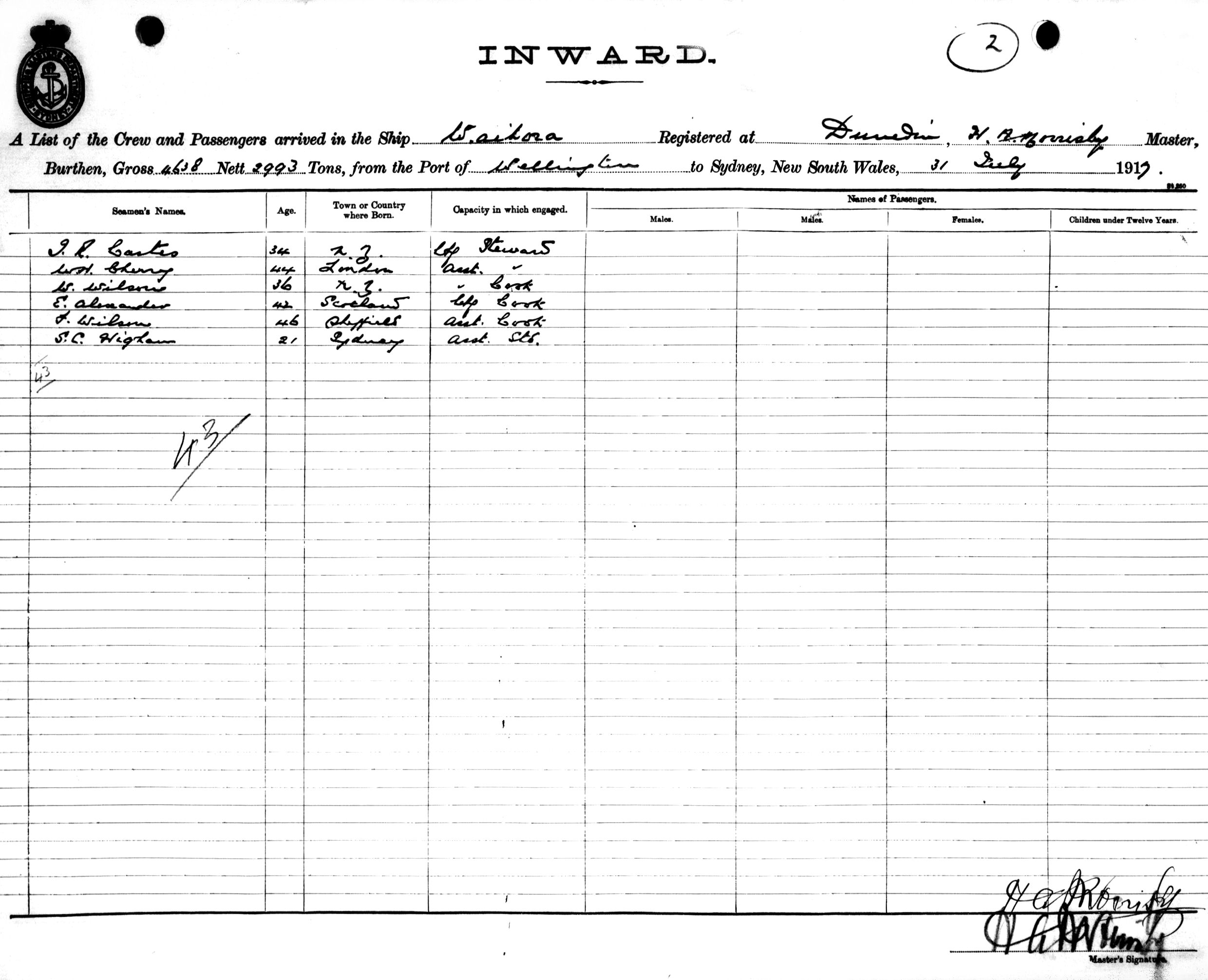 WAIHORAOF DUNEDIN, H. A. MORRISBY, MASTER, BURTHEN 4638/2993 TONS FROM THE PORT OF WELLINGTON via NEWCASTLE TO SYDNEY, NEW SOUTH WALES, 31ST JULY 1917 |