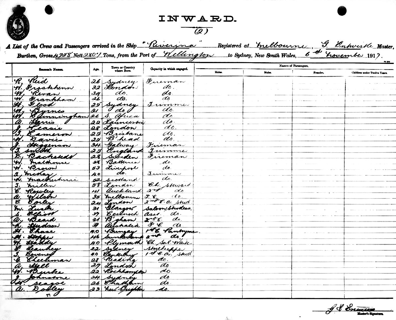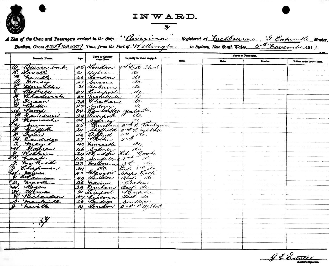 RIVERINAOF MELBOURNE, G. F. ENTWISLE, MASTER, BURTHEN 4758/2807 TONS FROM THE PORT OF WELLINGTON TO SYDNEY, NEW SOUTH WALES, 6TH NOVEMBER 1917 |