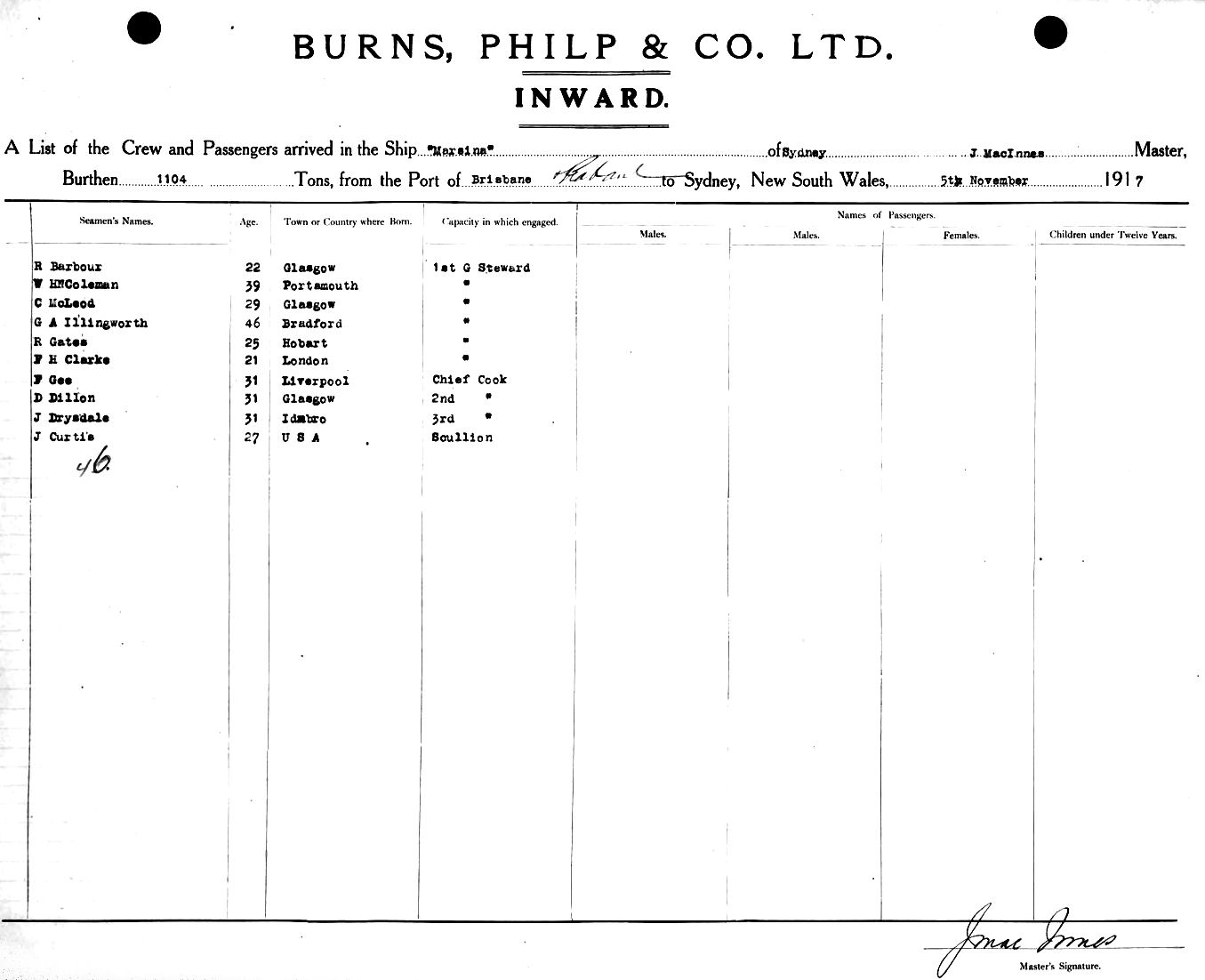 MARSINAOF SYDNEY, J. MACINNES, MASTER, BURTHEN 1104 TONS FROM THE PORTS OF BRISBANE & RABAUL TO SYDNEY, NEW SOUTH WALES, 5TH NOVEMBER 1917 |