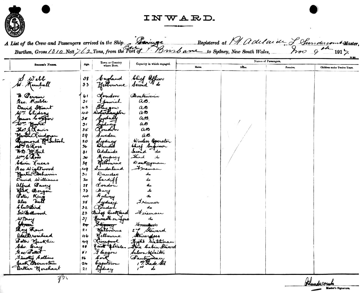 PARINGAOF PORT ADELAIDE, L. SUNDERCOMBE, MASTER, BURTHEN 1310/762 TONS FROM THE PORT OF CAIRNS via BRISBANE TO SYDNEY, NEW SOUTH WALES, 9TH NOVEMBER 1917 |