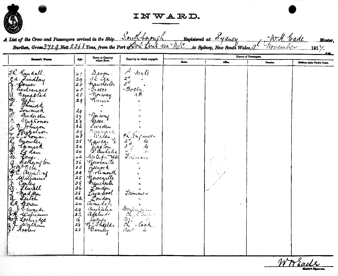 SOUTHBOROUGHOF SYDNEY, W. H. EADE, MASTER, BURTHEN 3709/2368 TONS FROM THE PORT OF PORT PIRIE via NEWCASTLE TO SYDNEY, NEW SOUTH WALES, 9TH NOVEMBER 1917 |