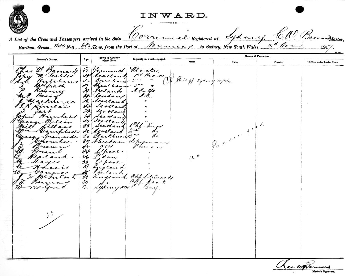 CORRIMALOF SYDNEY, C. W. BARNARD, MASTER, BURTHEN 1140/682 TONS FROM THE PORT OF NOUMEA TO SYDNEY, NEW SOUTH WALES, 10TH NOVEMBER 1917 |