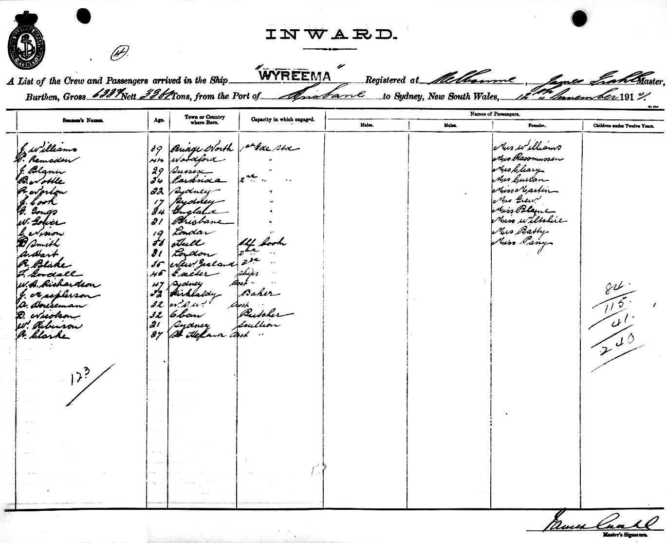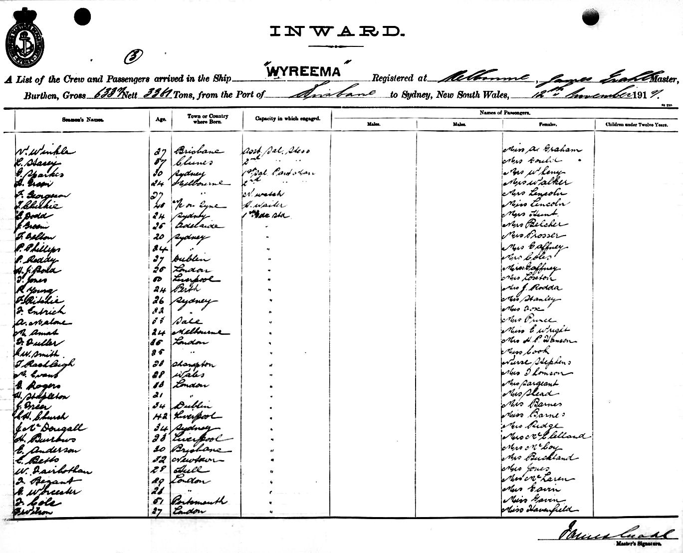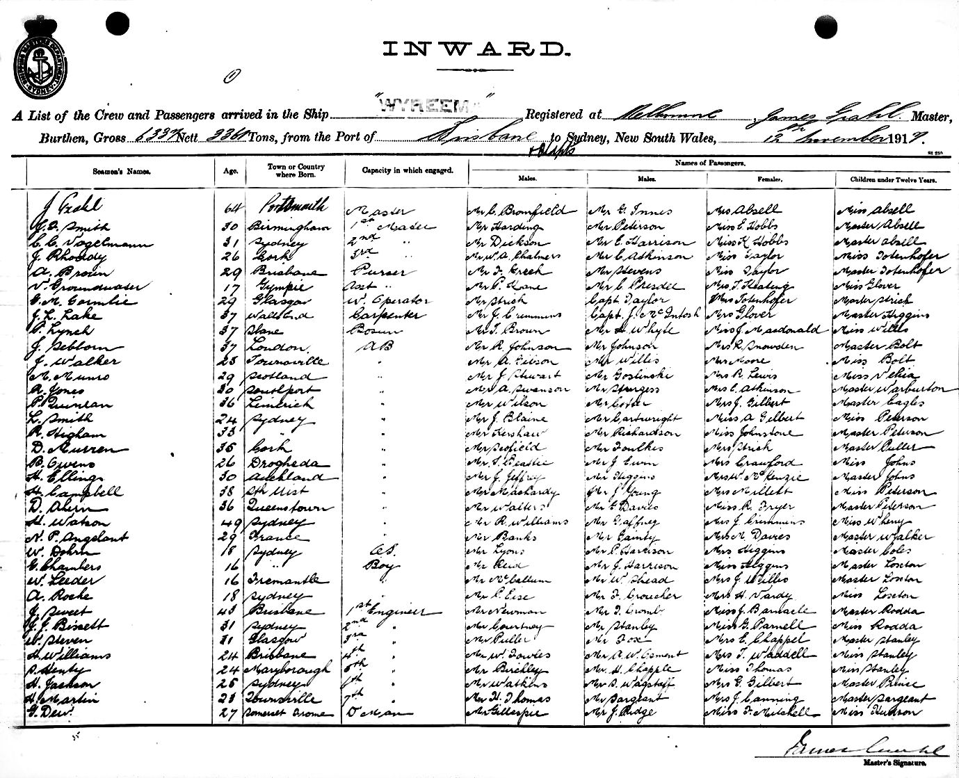 WYREEMAOF MELBOURNE, JAMES GRAHL, MASTER, BURTHEN 6337/3361 TONS FROM THE PORT OF BRISBANE & QUEENSLAND PORTS TO SYDNEY, NEW SOUTH WALES, 12TH NOVEMBER 1917 |