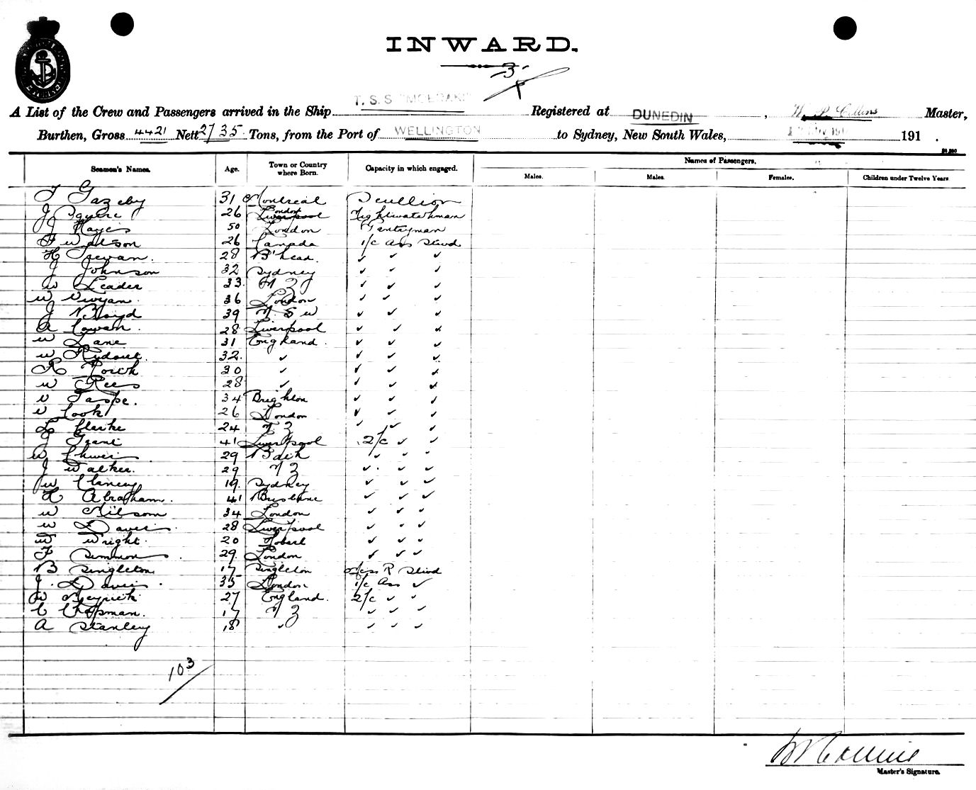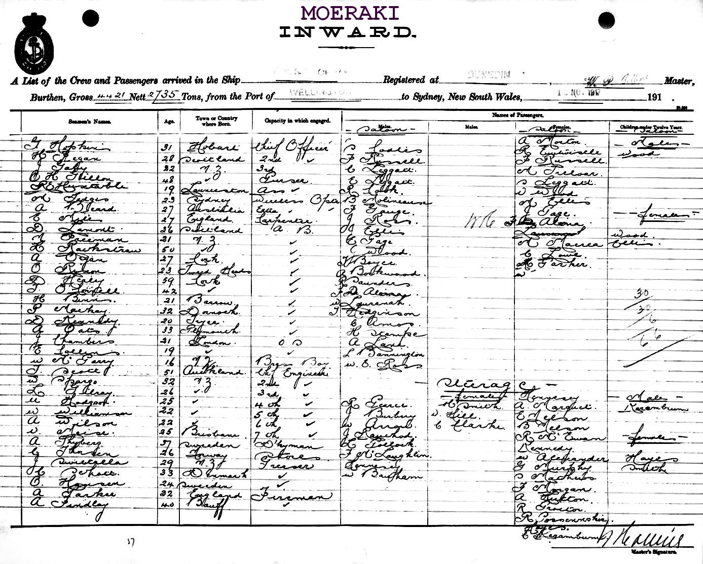 MOERAKIOF DUNEDIN, W. P. COLLINS, MASTER, BURTHEN 4421/2735 TONS FROM THE PORT OF WELLINGTON TO SYDNEY, NEW SOUTH WALES, 12TH NOVEMBER 1917 |