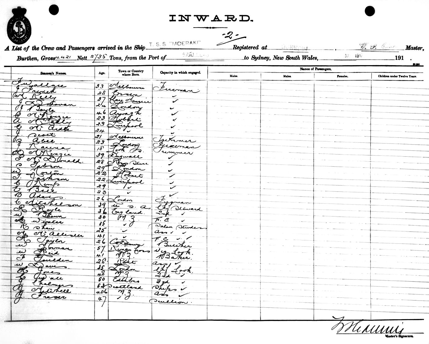 Source: State Records Authority of New South Wales: Shipping Master's Office; Passengers Arriving 1855 - 1922;  NRS13278,  [X427] reel 2100.   Transcribed by Lyn & Maurie. You may view/print a scan of the original list       - a monitor set to high resolution is recommended for clarity. Use your back button to return.  |