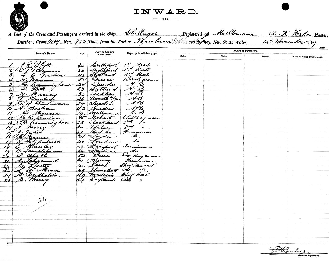 CHILLAGOEOF MELBOURNE, A. K. FORBES, MASTER, BURTHEN 1489/955 TONS FROM THE PORT OF BRISBANE TO SYDNEY, NEW SOUTH WALES, 12TH NOVEMBER 1917 |