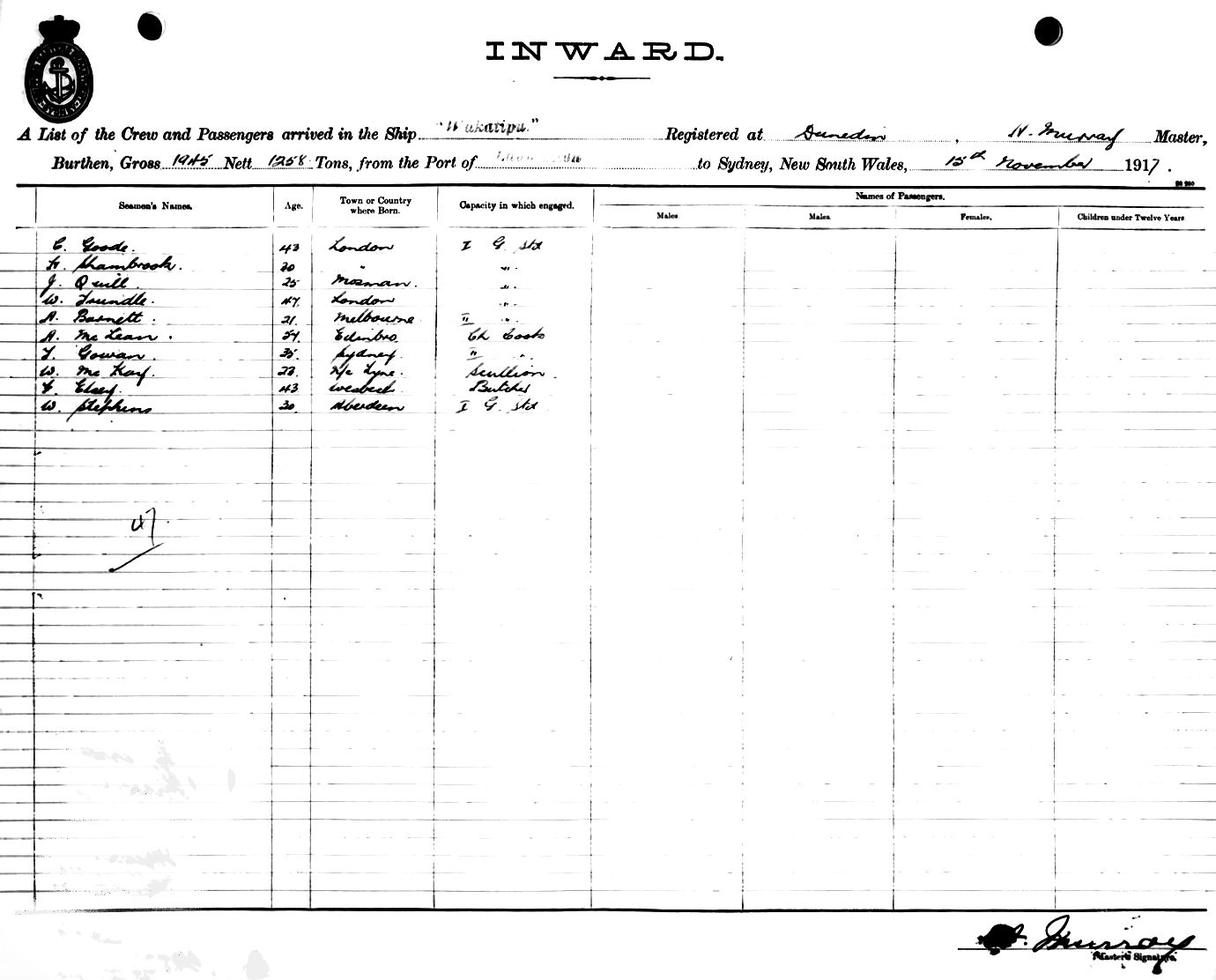 WAKATIPUOF DUNEDIN, A. MURRAY, MASTER, BURTHEN 1945/1258 TONS FROM THE PORT OF LAUNCESTON TO SYDNEY, NEW SOUTH WALES, 15TH NOVEMBER 1917 |