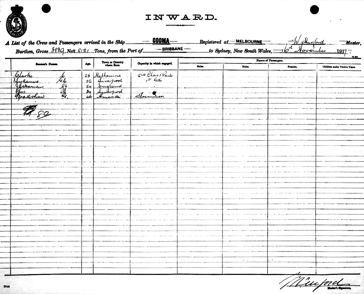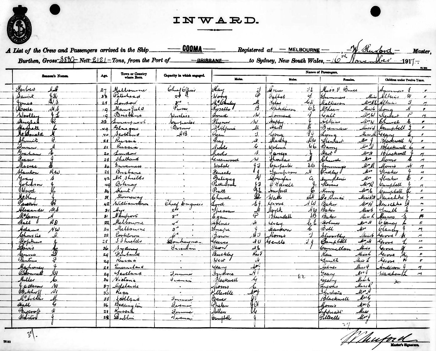 COOMAOF MELBOURNE, W. HURFORD, MASTER, BURTHEN 3839/2121 TONS FROM THE PORT OF BRISBANE TO SYDNEY, NEW SOUTH WALES, 16TH NOVEMBER 1917 |