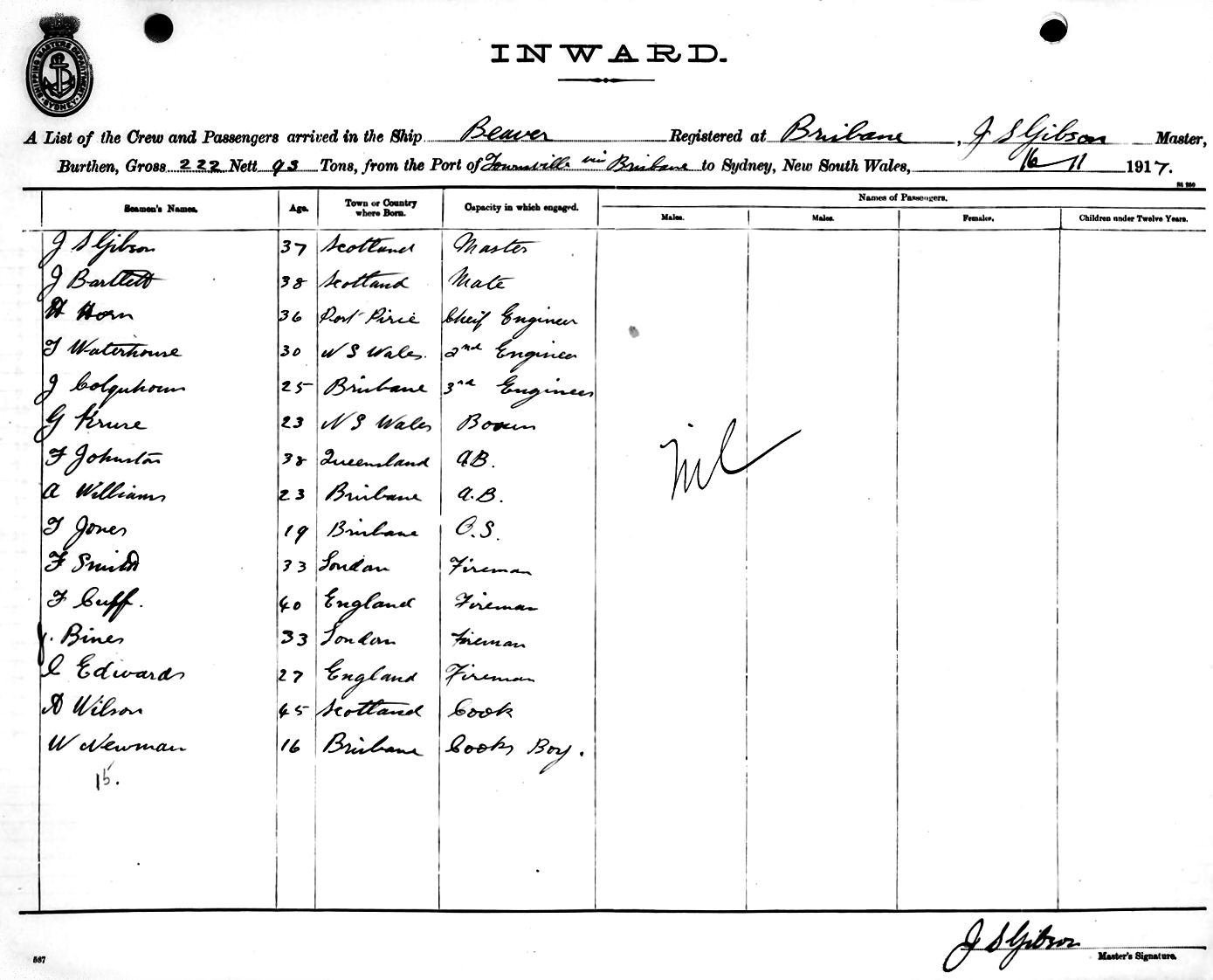 BEAVERTUG OF BRISBANE, J. S. GIBSON, MASTER, BURTHEN 222/93 TONS FROM THE PORT OF TOWNSVILLE via BRISBANE TO SYDNEY, NEW SOUTH WALES, 16TH NOVEMBER 1917 |