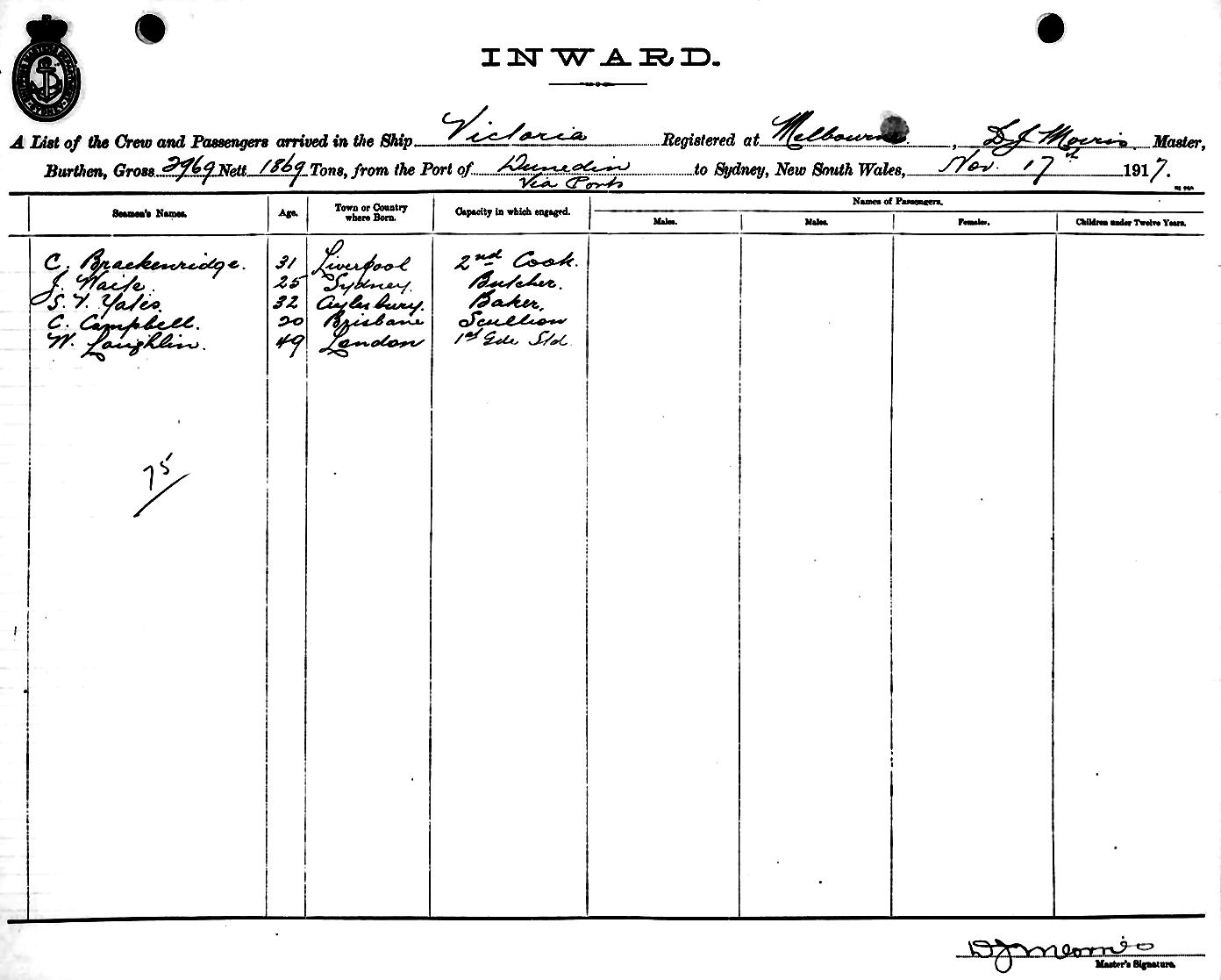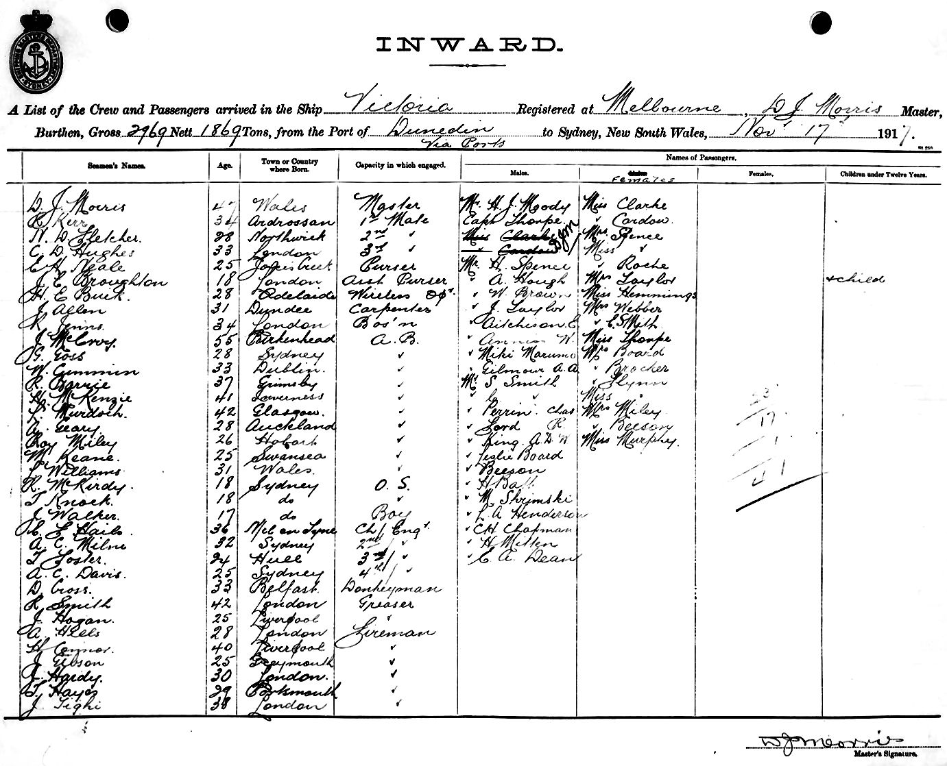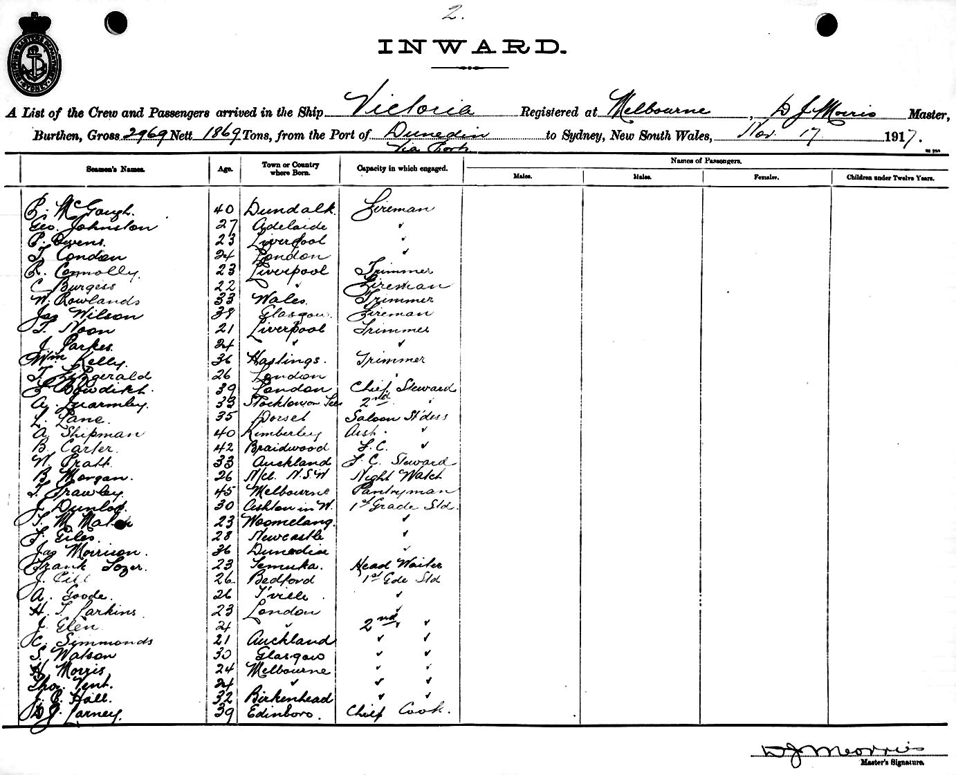 VICTORIAOF MELBOURNE, D. J. MORRIS, MASTER, BURTHEN 2969/1869 TONS FROM THE PORT OF DUNEDIN via PORTS TO SYDNEY, NEW SOUTH WALES, 17TH NOVEMBER 1917 |