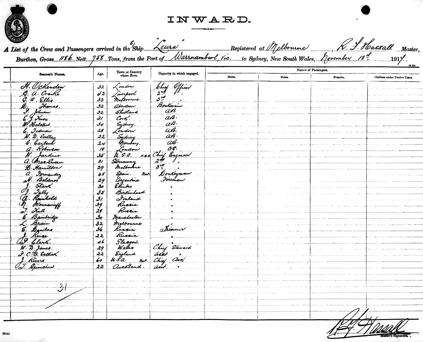 LEURAOF MELBOURNE, R. F. HASSALL, MASTER, BURTHEN 1186/758 TONS FROM THE PORT OF WARRNAMBOOL TO SYDNEY, NEW SOUTH WALES, 18TH NOVEMBER 1917 |