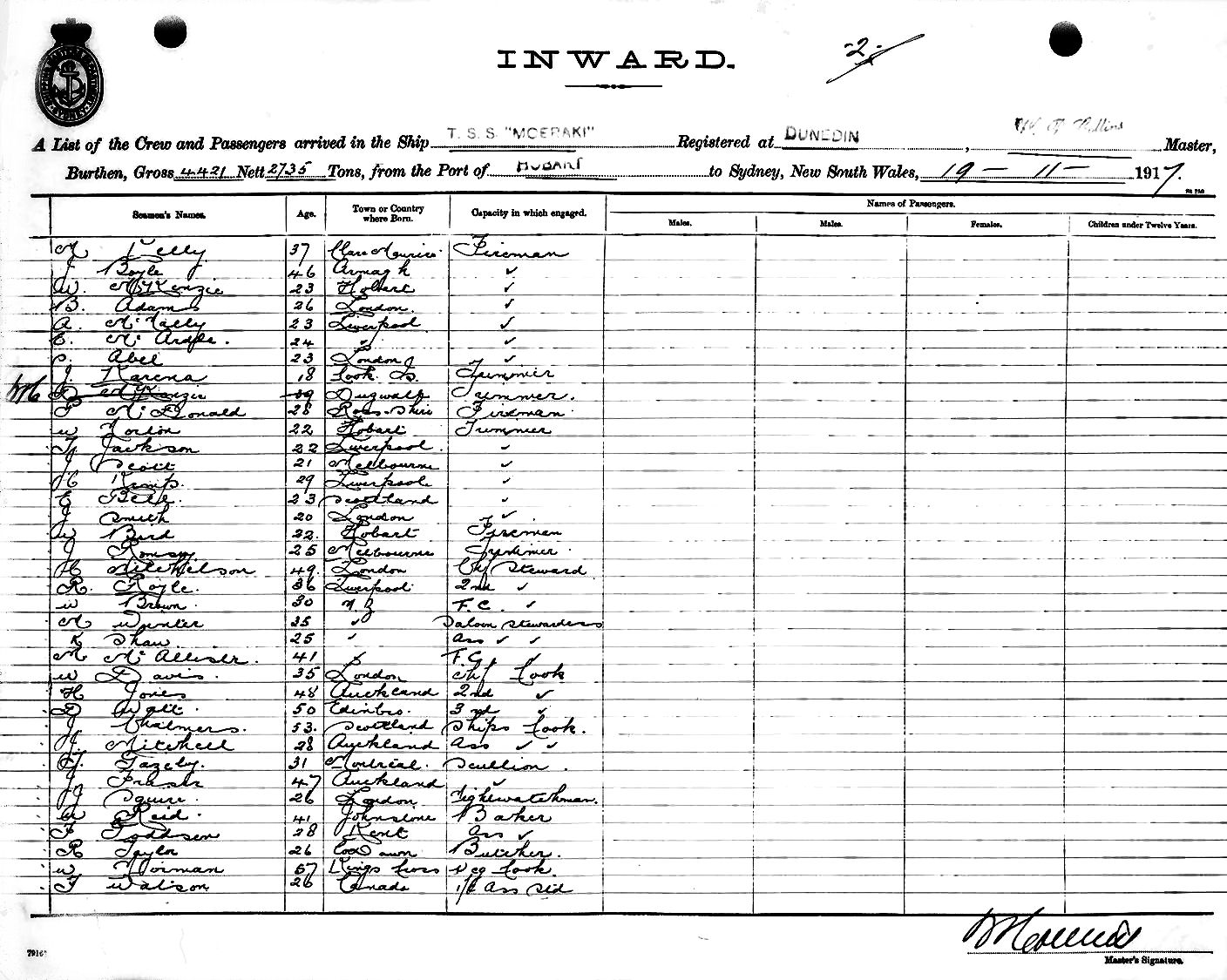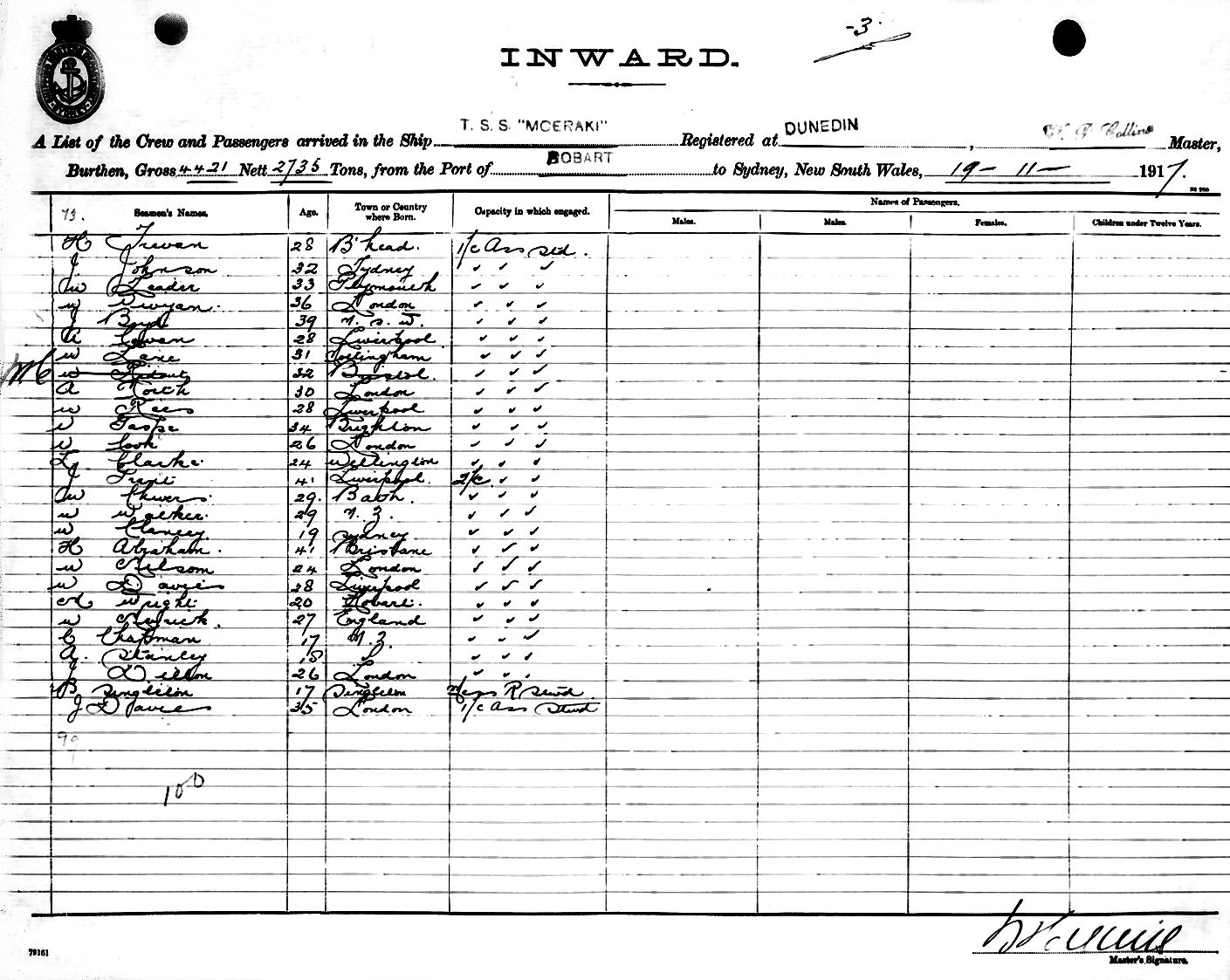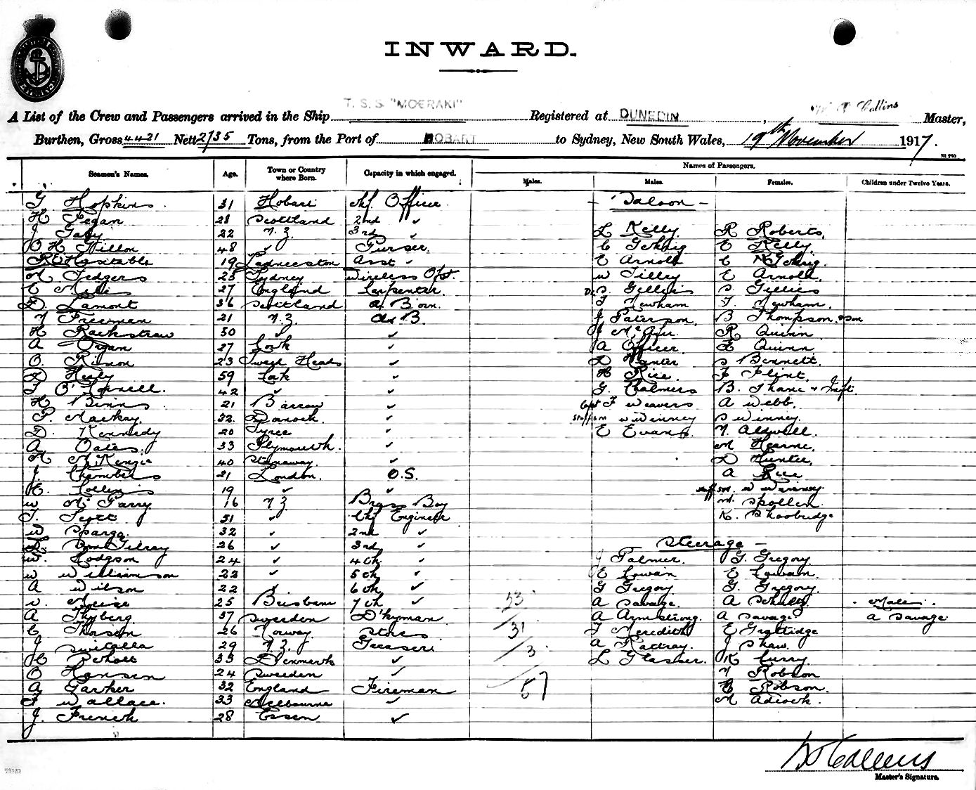 MOERAKIOF DUNEDIN, W. P. COLLINS, MASTER, BURTHEN 4421/2735 TONS FROM THE PORT OF HOBART TO SYDNEY, NEW SOUTH WALES, 19TH NOVEMBER 1917 |