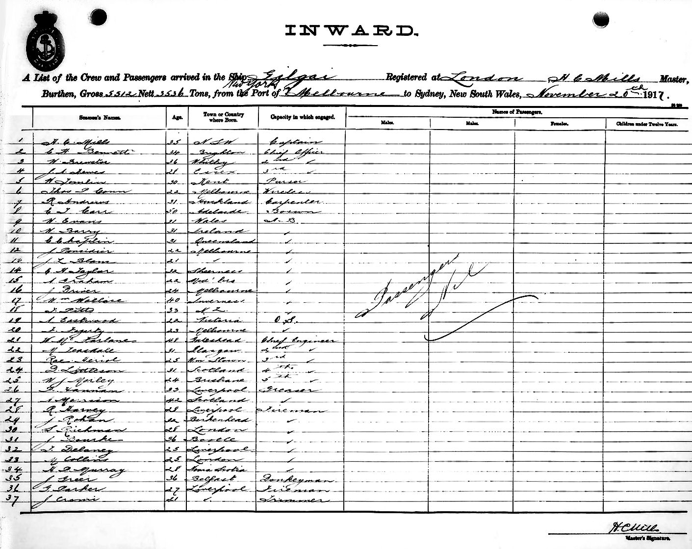 GILGAIOF LONDON, H. C. MILLS, MASTER, BURTHEN 5512/3536 TONS FROM THE PORT OF NEW YORK via MELBOURNE TO SYDNEY, NEW SOUTH WALES, 20TH NOVEMBER 1917 |