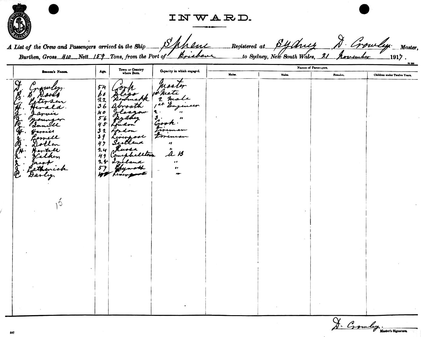 SPHENEOF SYDNEY, D. CROWLEY, MASTER, BURTHEN 410/159 TONS FROM THE PORT OF BRISBANE TO SYDNEY, NEW SOUTH WALES, 21ST NOVEMBER 1917 |