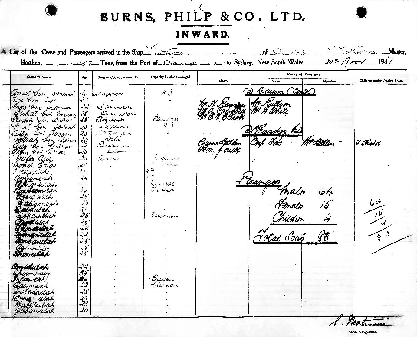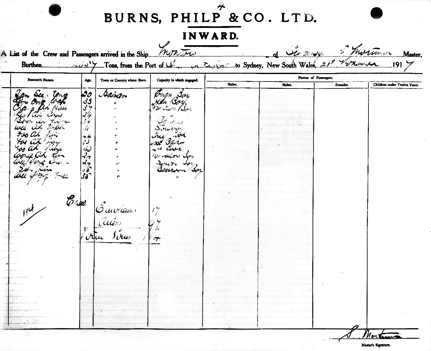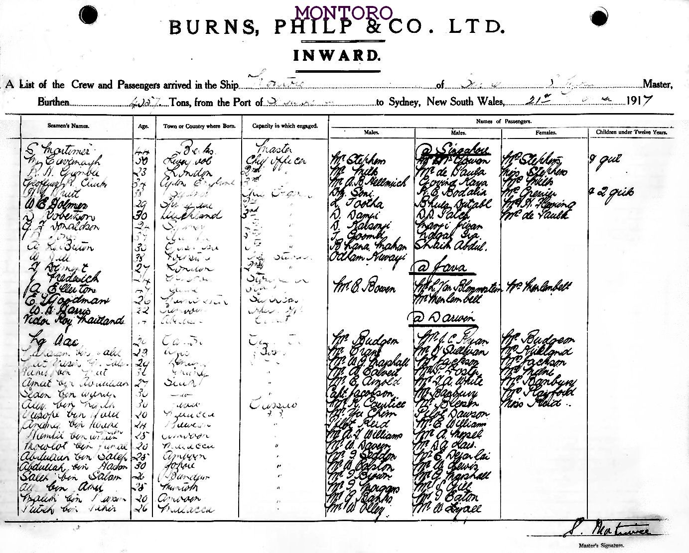 MONTOROOF SYDNEY, S. MORTIMER, MASTER, BURTHEN 4057 TONS FROM THE PORT OF SINGAPORE via PORTS TO SYDNEY, NEW SOUTH WALES, 21ST NOVEMBER 1917 |