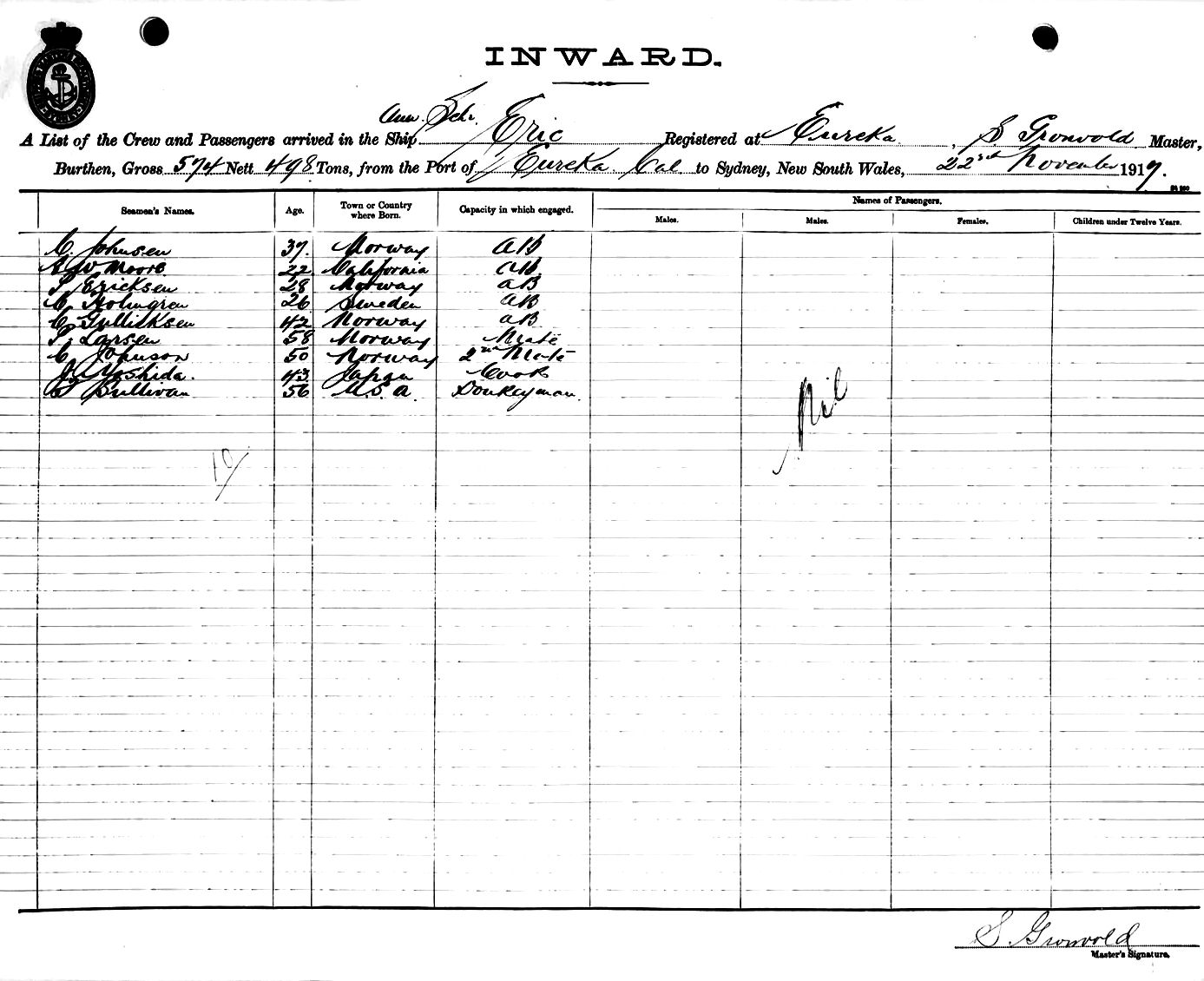 ERICOF EUREKA, S. GRONWOLD, MASTER, BURTHEN 574/498 TONS FROM THE PORT OF EUREKA, CALIFORNIA TO SYDNEY, NEW SOUTH WALES, 22ND NOVEMBER 1917 |