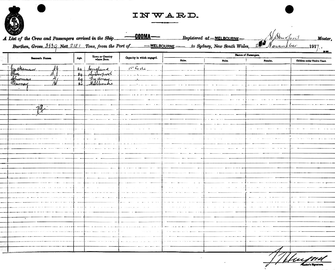 COOMAOF MELBOURNE, W. HURFORD, MASTER, BURTHEN 3839/2121 TONS FROM THE PORT OF MELBOURNE TO SYDNEY, NEW SOUTH WALES, 23RD NOVEMBER 1917 |