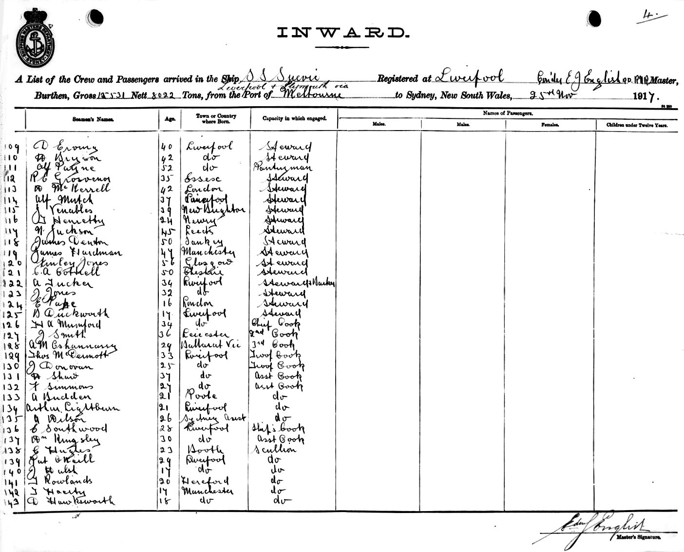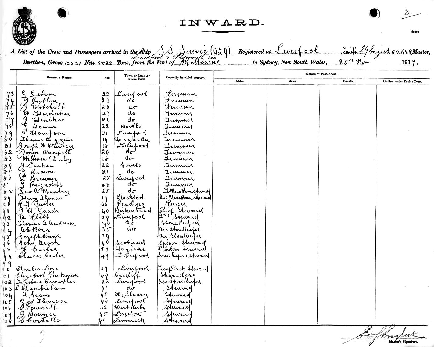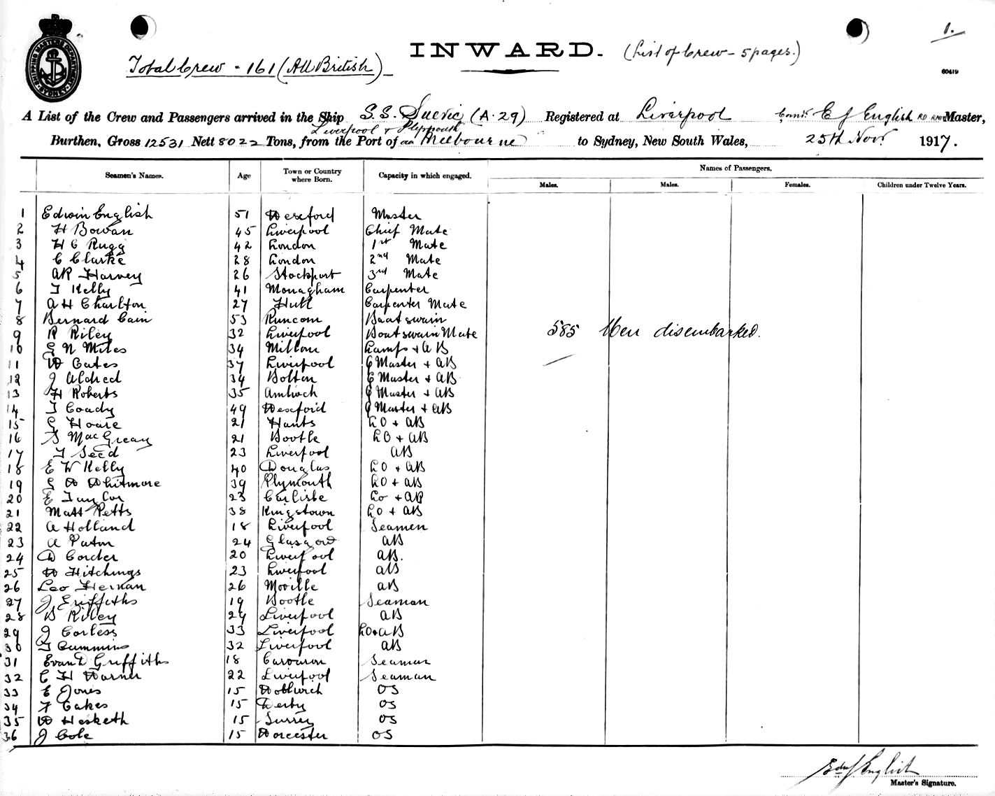 SUEVICOF LIVERPOOL, E. J. ENGLISH, MASTER, BURTHEN 12531/8022 TONS FROM THE PORTS OF LIVERPOOL & PLYMOUTH via MELBOURNE TO SYDNEY, NEW SOUTH WALES, 25TH NOVEMBER 1917 |