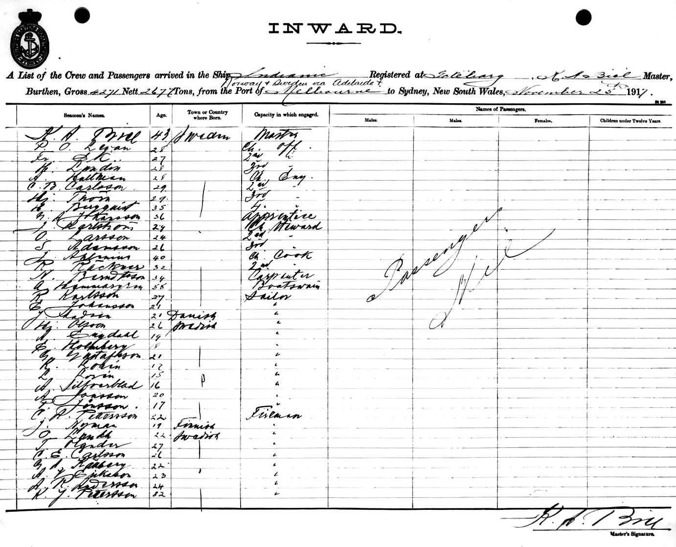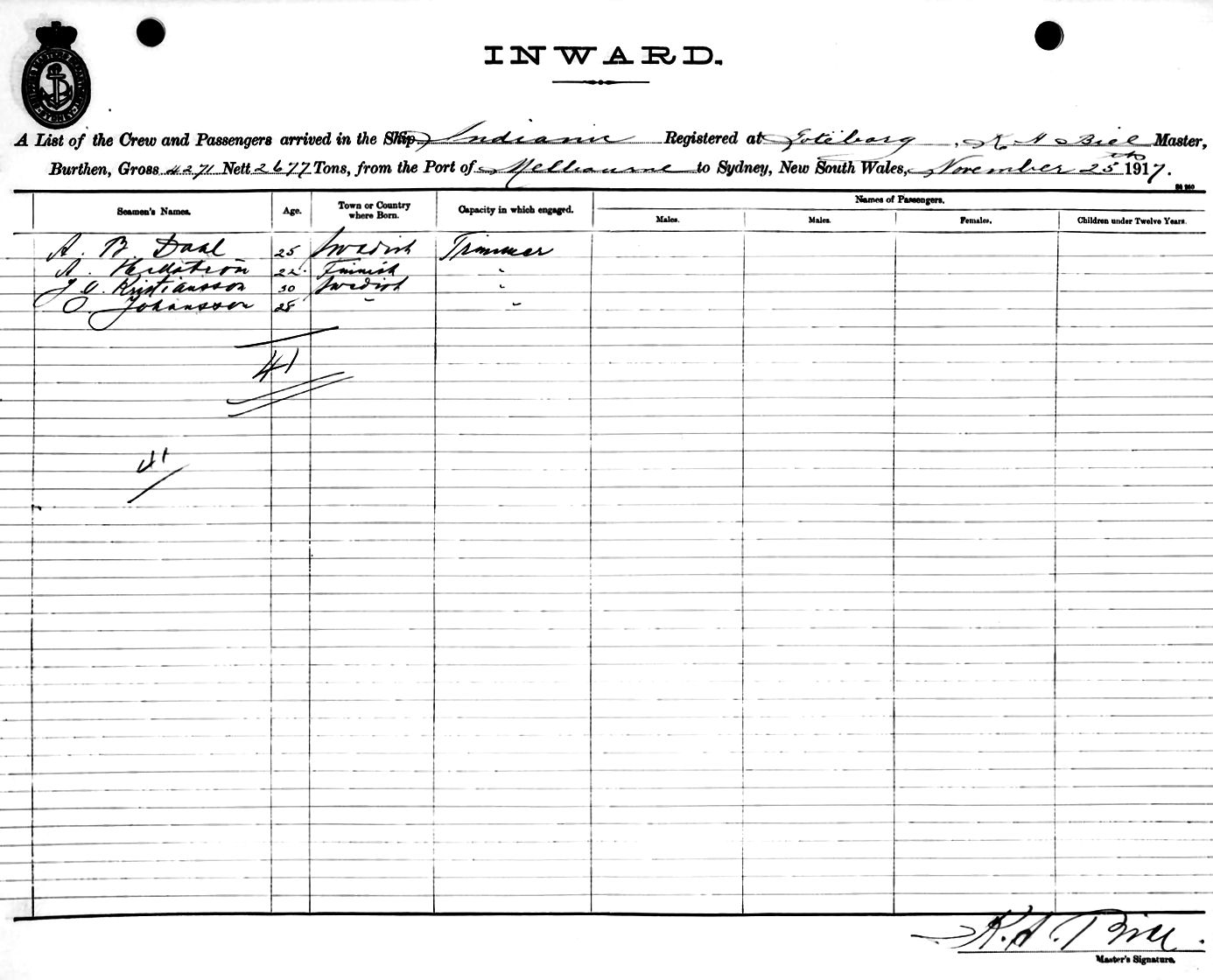 INDIANICOF GOTEBORG, K. A. BIEL, MASTER, BURTHEN 4171/2677 TONS FROM THE PORT OF NORWAY & SWEDEN via ADELAIDE & MELBOURNE TO SYDNEY, NEW SOUTH WALES, 25TH NOVEMBER 1917 |