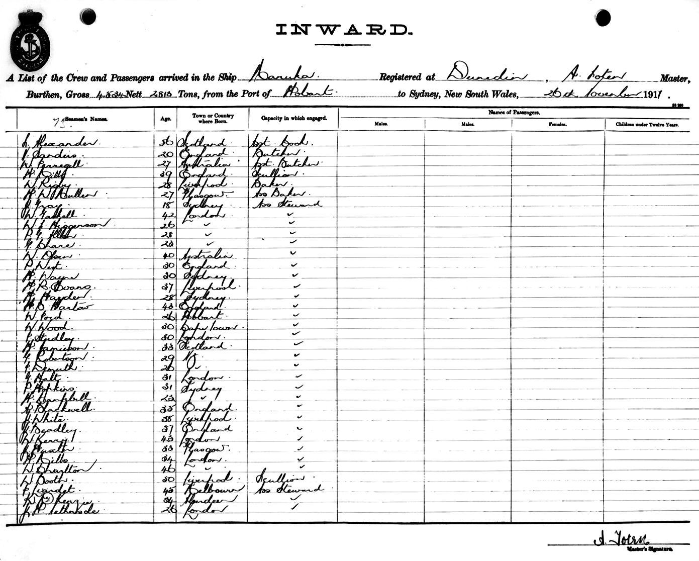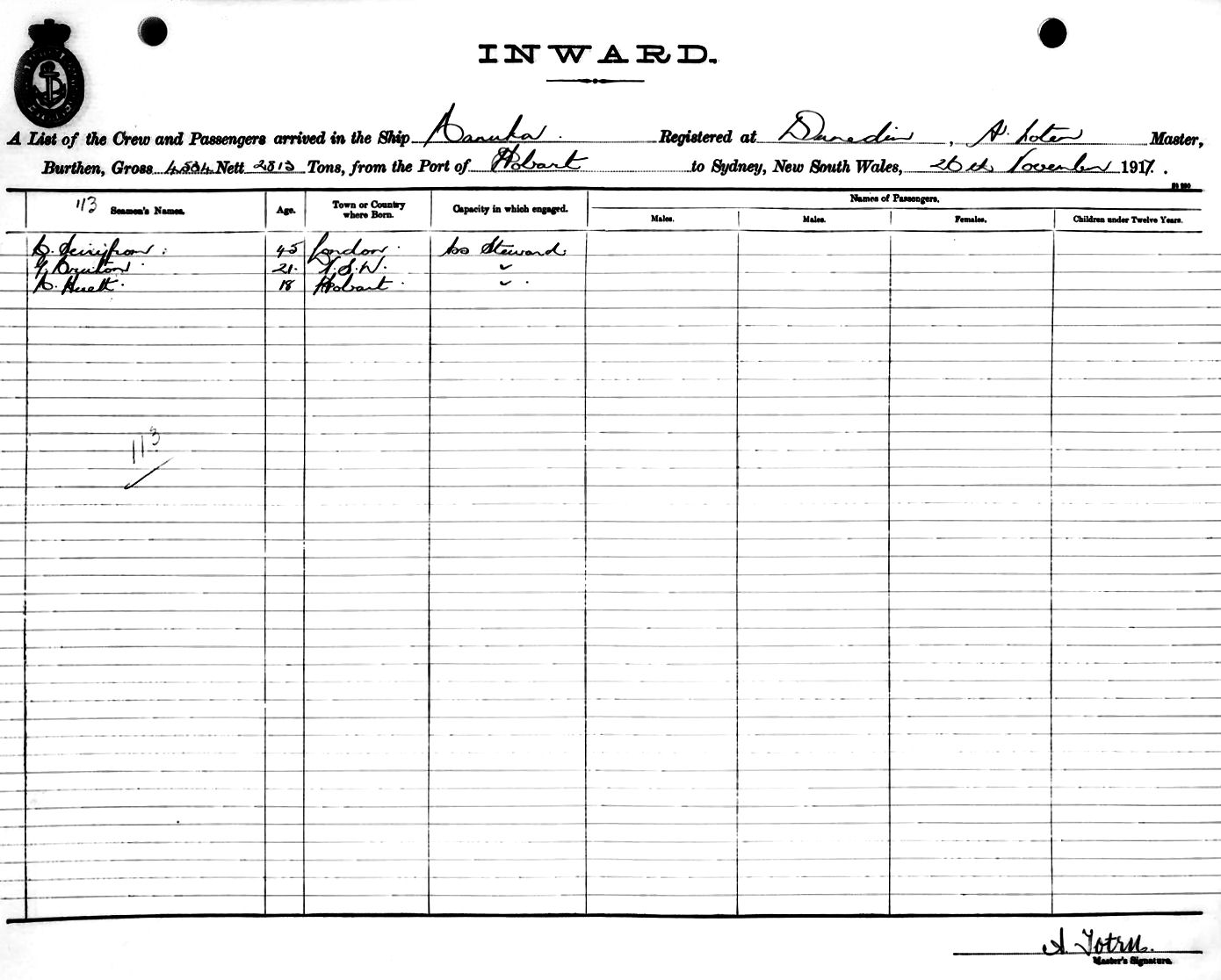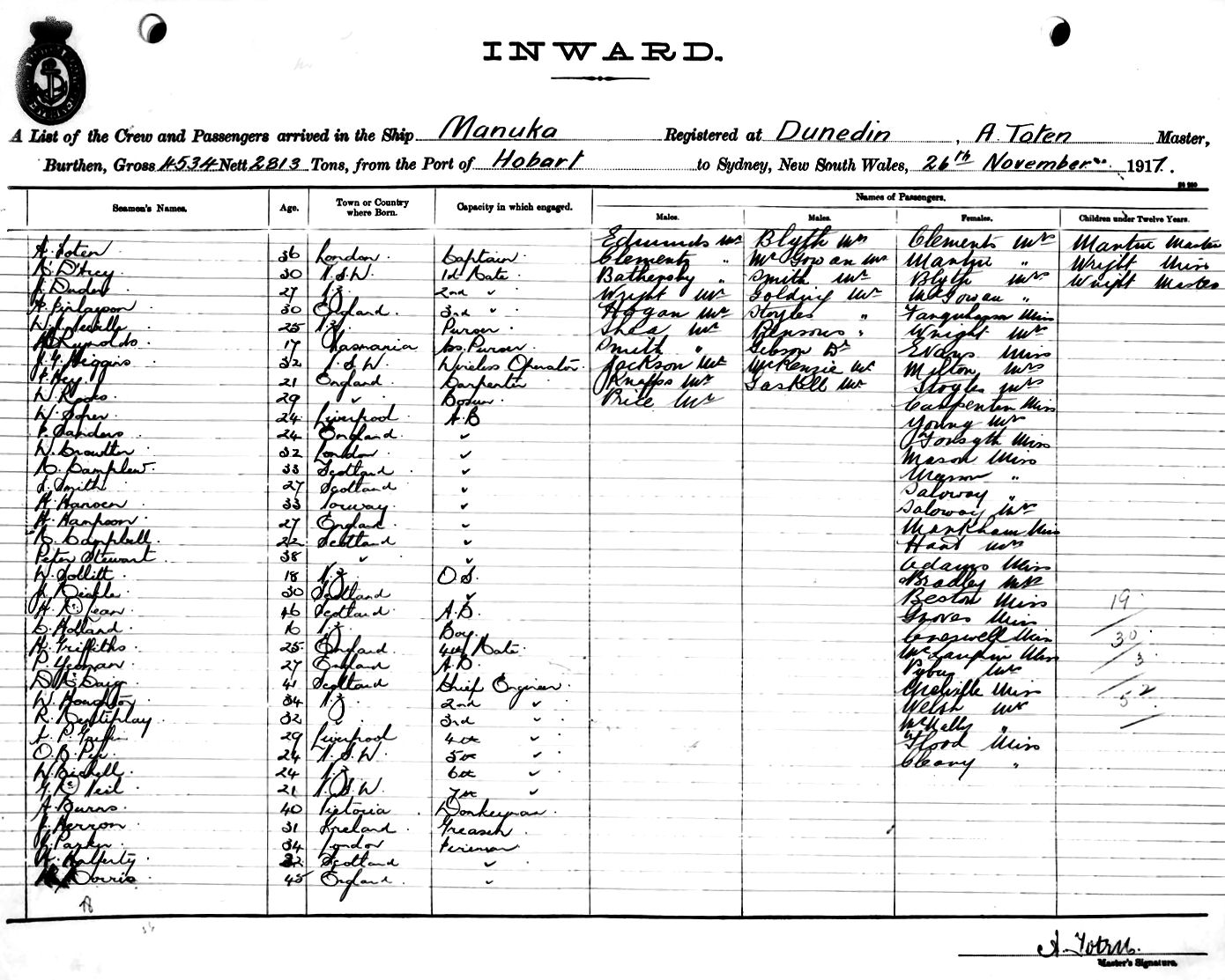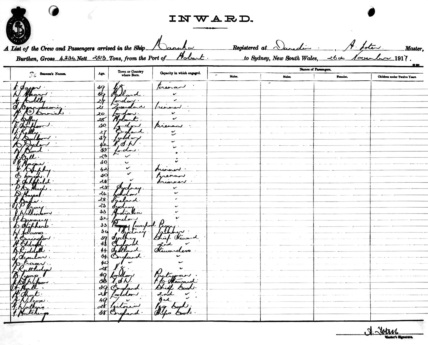 MANUKAOF DUNEDIN, A. TOTEN, MASTER, BURTHEN 4534/2813 TONS FROM THE PORT OF HOBART TO SYDNEY, NEW SOUTH WALES, 26TH NOVEMBER 1917 |