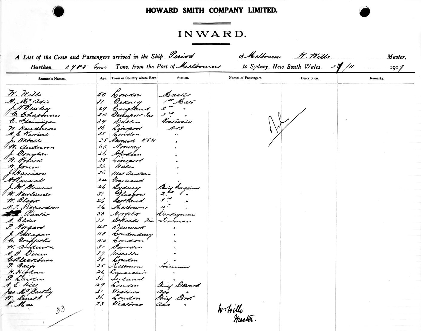 Mariners and ships in Australian Waters |  PERIODOF MELBOURNE, W. WILLS, MASTER, BURTHEN 2785 TONS FROM THE PORT OF MELBOURNE TO SYDNEY, NEW SOUTH WALES, 27TH NOVEMBER 1917 |
