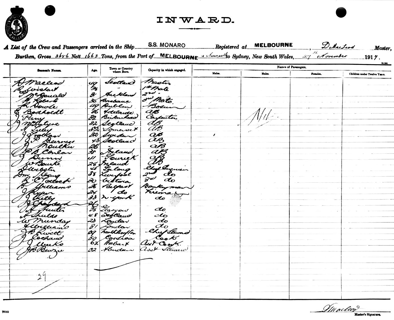 MONAROOF MELBOURNE, D. MACLEOD, MASTER, BURTHEN 2656/1663 TONS FROM THE PORT OF MELBOURNE & NEWCASTLE TO SYDNEY, NEW SOUTH WALES, 27TH NOVEMBER 1917 |