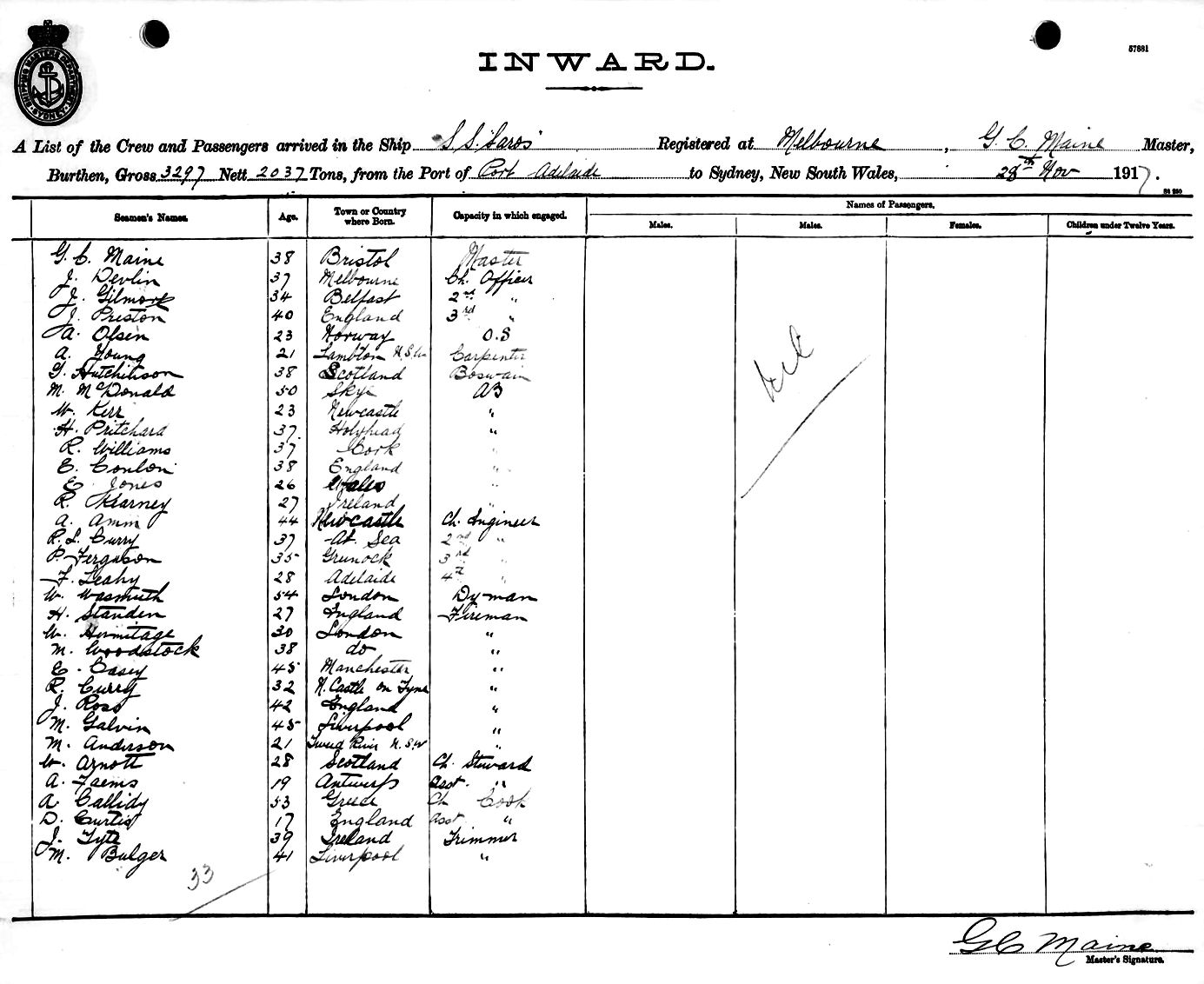 SAROSOF MELBOURNE, G. C. MAINE, MASTER, BURTHEN 3297/2037 TONS FROM THE PORT OF PORT ADELAIDE TO SYDNEY, NEW SOUTH WALES, 28TH NOVEMBER 1917 |