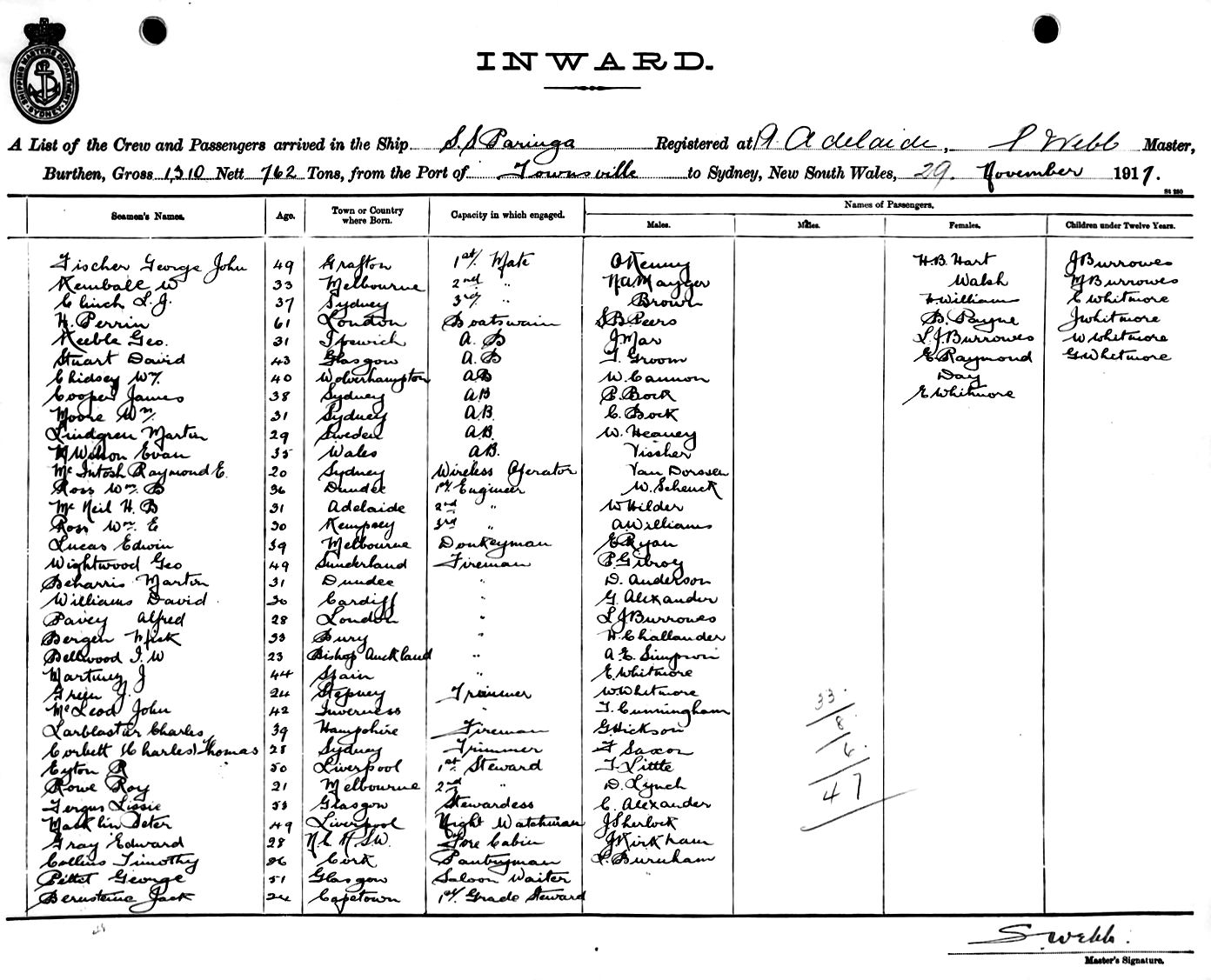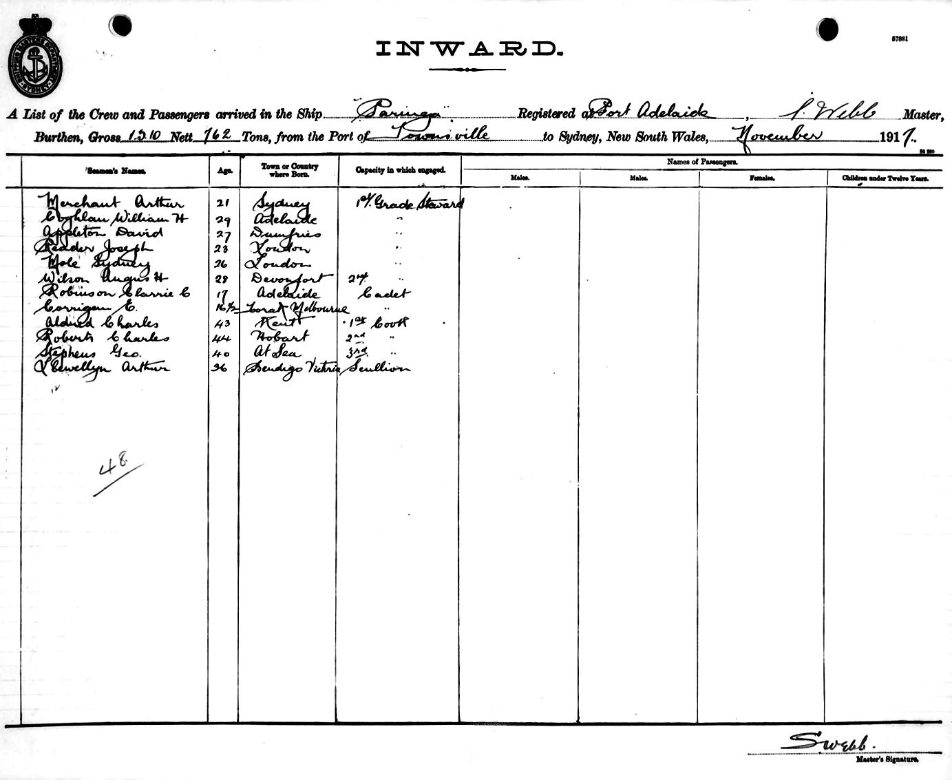 Mariners and ships in Australian Waters |  PARINGAOF PORT ADELAIDE, P. WEBB, MASTER, BURTHEN 1310/762 TONS FROM THE PORT OF TOWNSVILLE TO SYDNEY, NEW SOUTH WALES, 29TH NOVEMBER 1917 |