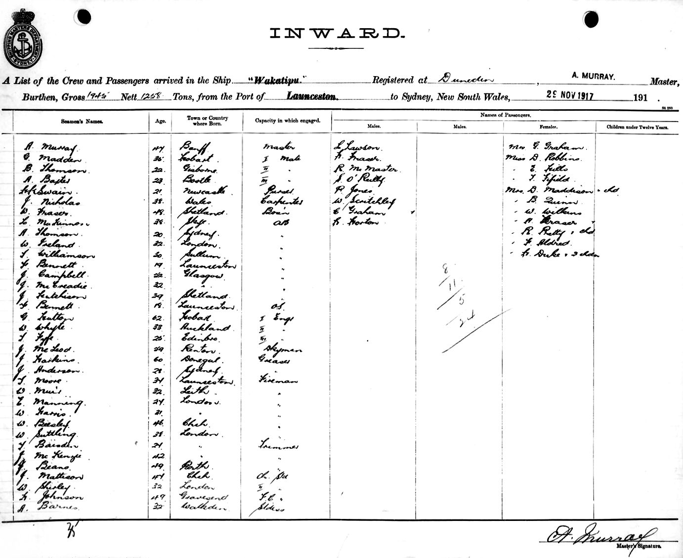 WAKATIPUOF DUNEDIN, A. MURRAY, MASTER, BURTHEN 1945/1258 TONS FROM THE PORT OF LAUNCESTON TO SYDNEY, NEW SOUTH WALES, 29TH NOVEMBER 1917 |