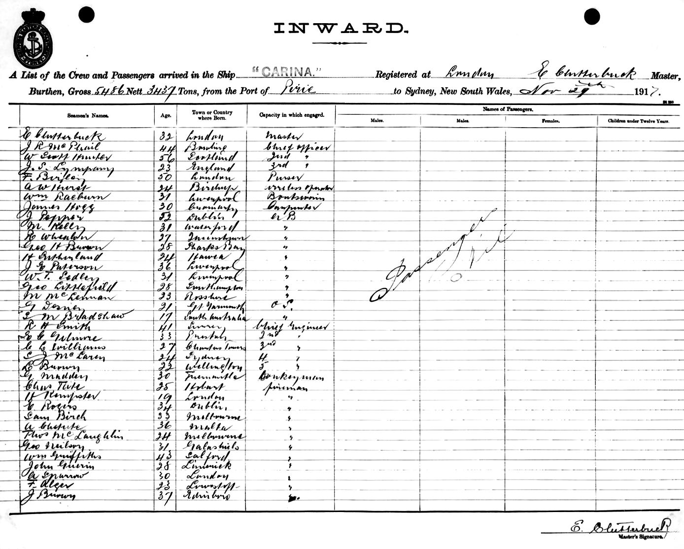 Mariners and ships in Australian Waters |  CARINAOF LONDON, E. CLUTTERBUCK, MASTER, BURTHEN 5486/3437 TONS FROM THE PORT OF PORT PIRIE TO SYDNEY, NEW SOUTH WALES, 29TH NOVEMBER 1917 |