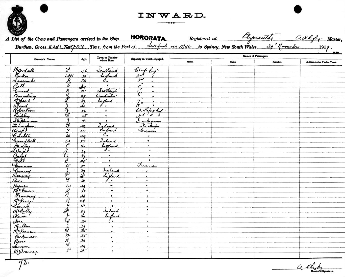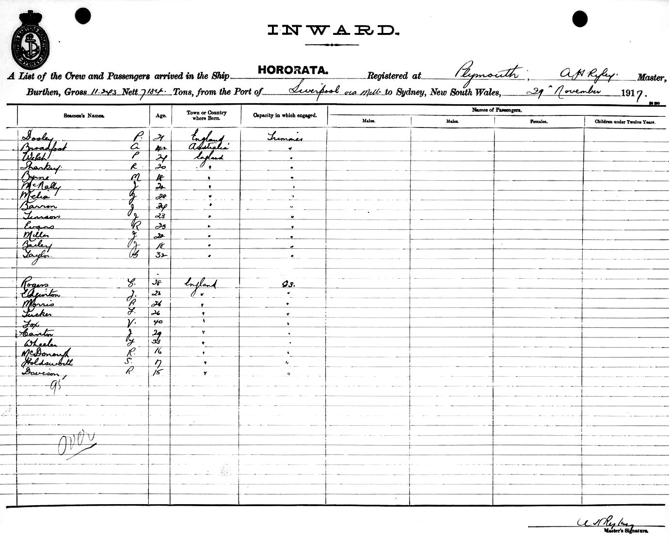HORORATAOF PLYMOUTH, A. H. RYLEY, MASTER, BURTHEN 11,243/7184 TONS FROM THE PORT OF LIVERPOOL via MELBOURNE TO SYDNEY, NEW SOUTH WALES, 29TH NOVEMBER 1917 |